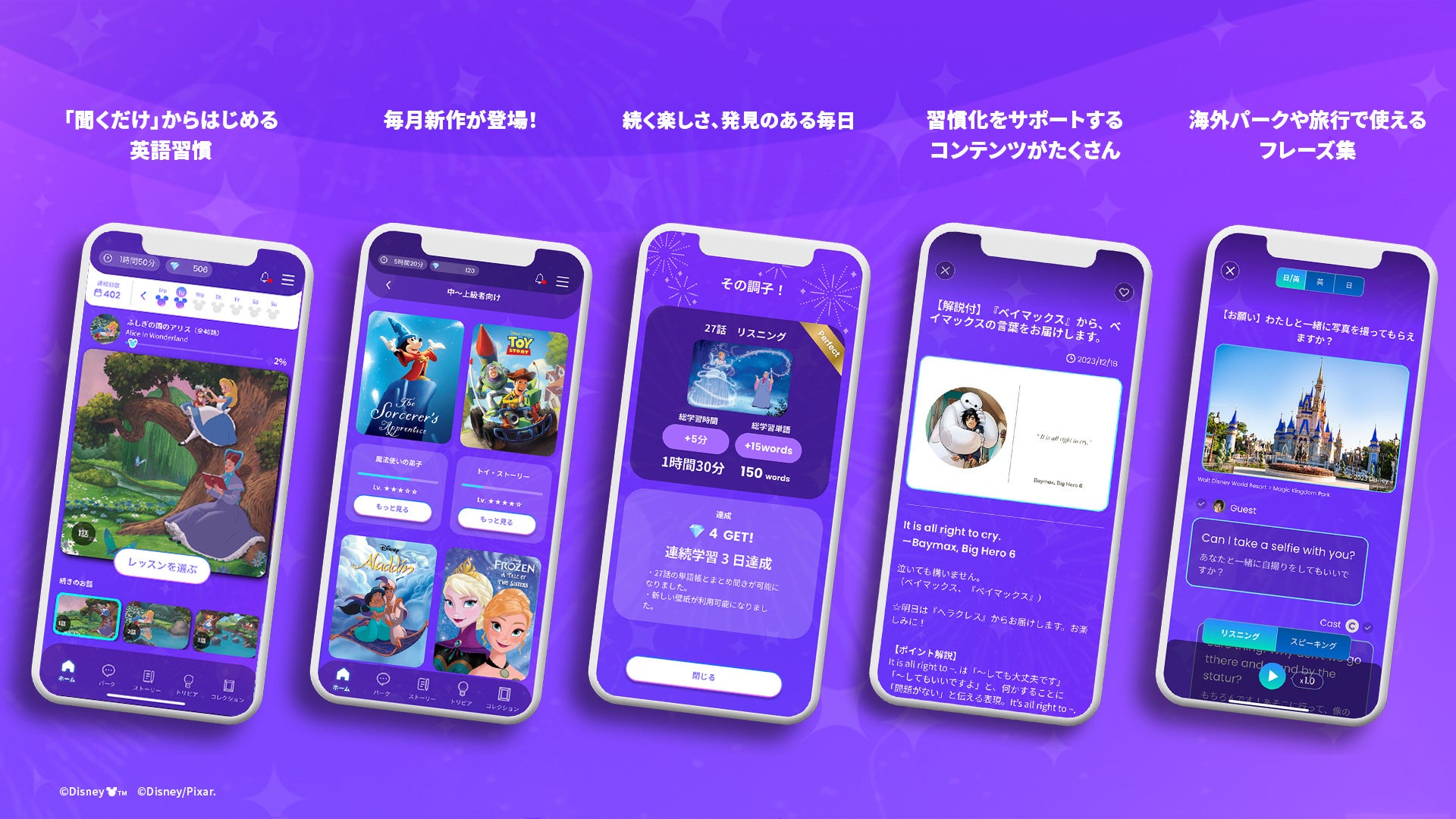 本アプリはディズニーやピクサーの作品で英語が学べる大人向け英語学習アプリです 。ながら学習、スキマ学習に最適な「聞くだけ」から気軽に始められるので、忙しい方や英語初級者の方でも取り組みやすく続けやすいのが特徴です。獲得した学習ポイント(ジュエル)を消費することで、基本無料で次のレッスンを続けられる他、貯まったジュエルで、デジタルアートコレクションを獲得するチャンスがあるなど、楽しみながら英語を学ぶことができます。