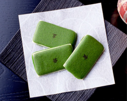 もっともふさわしい色・味・香りのお濃茶に調合した、「茶の菓」のためのオリジナルのお濃茶を使用。口溶けのよいラングドシャにミルク感豊かなオリジナルホワイトチョコレートをはさみました。