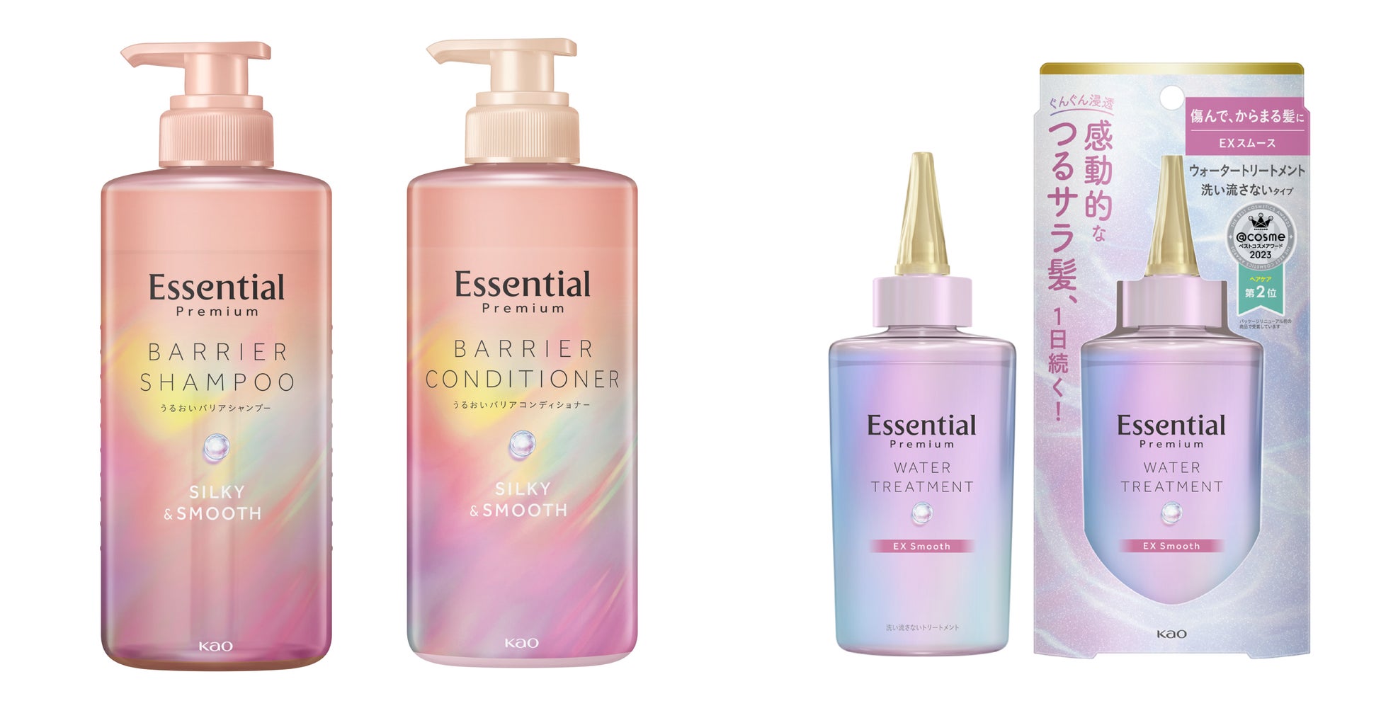 商品ラインアップは、美容のプロにも受け入れ性の高いこだわりの成分が好評の『エッセンシャル プレミアム バリアシャンプー・コンディショナー シルキー&スムース』ペアセットと、「#マーメイド髪水」の愛称で話題となり、ドライヤー速乾効果と感動的な指どおりが特長の『エッセンシャル プレミアム ウォータートリートメント EXスムース』です。