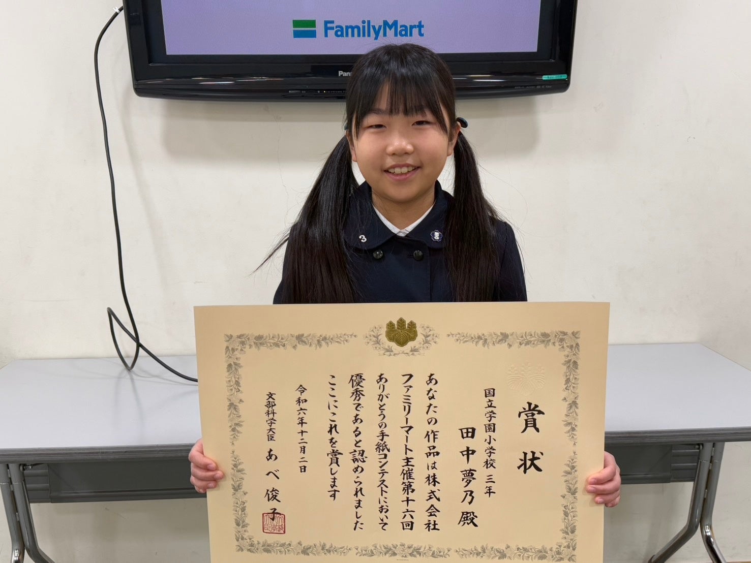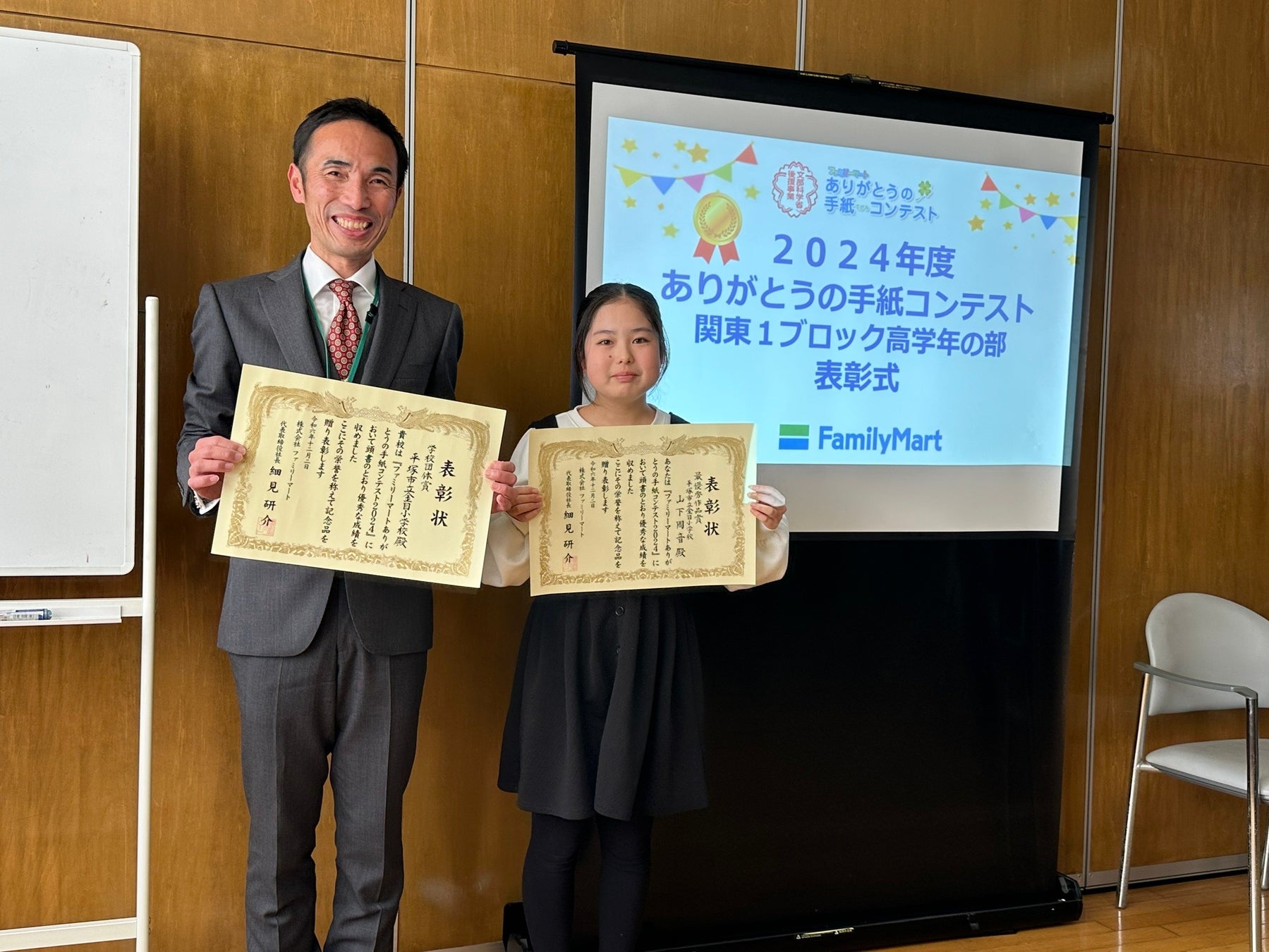 株式会社ファミリーマート(本社:東京都港区、代表取締役社長:細見研介)は、地域社会とともにこどもたちの成長を応援するため、2009年度から「ファミリーマートありがとうの手紙コンテスト」を開催しています。身近な人への感謝だけでなく、自然や環境、住みやすい街へも手紙を綴るこどもたちの作品が増えたことを踏まえ、16回目となる2024年度は「SDGs賞」を新設しました。ジャーナリストの池上彰氏を審査員長とする最終審査会を開催し、文部科学大臣賞、最優秀作品賞など数々の賞を決定しました。事前に許可をいただいた受賞児童が在籍する学校には、ファミリーマート社員が訪問し、表彰式を実施することができました。主な開催レポートをご紹介します。