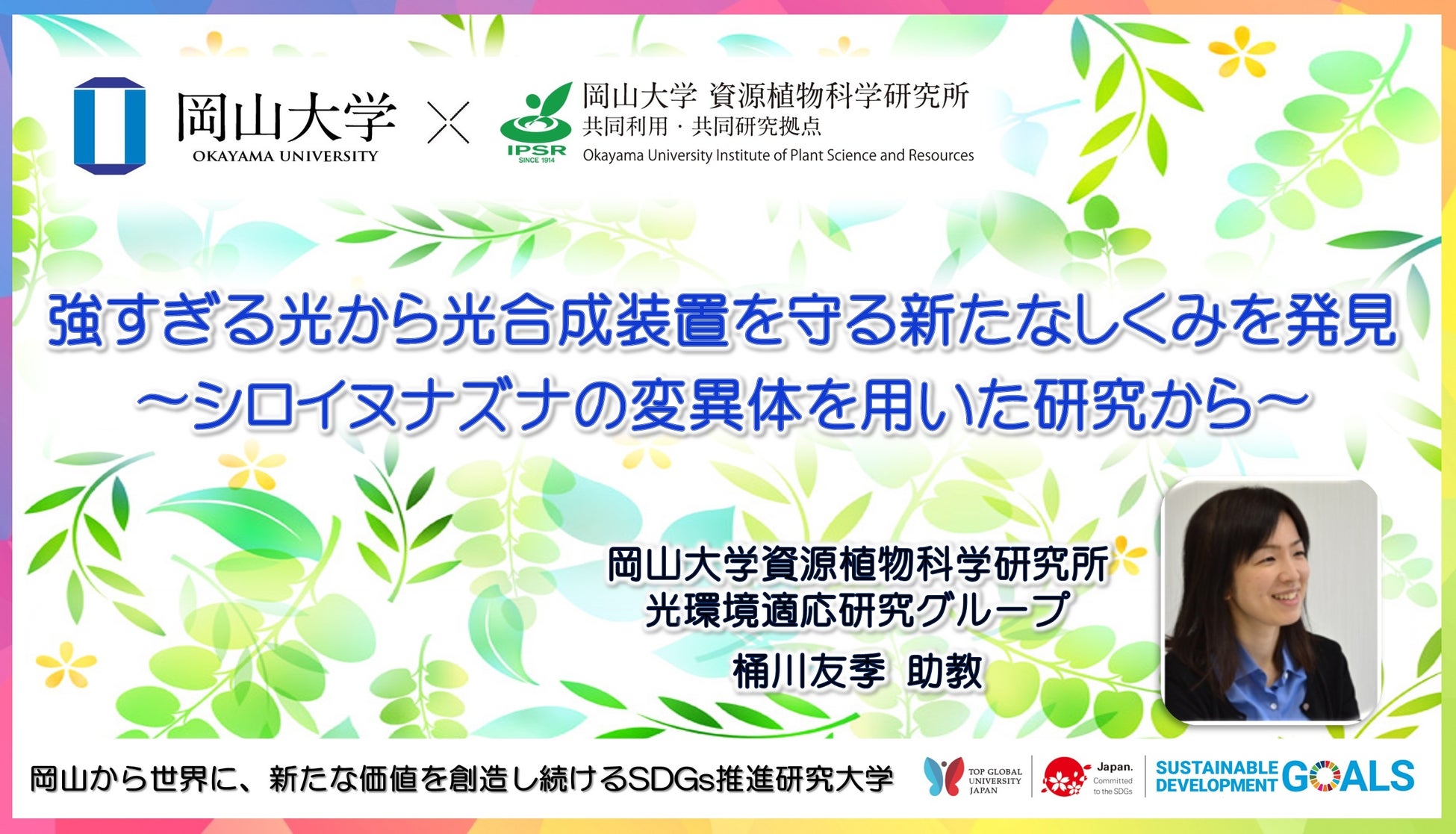国立大学法人岡山大学(本部:岡山市北区、学長:那須保友)の資源植物科学研究所(倉敷市中央)光環境適応研究グループの桶川友季助教と坂本亘教授らは、京都産業大学生命科学部と共同で研究を行い、植物の葉緑体において光合成の調節因子として働くことが知られていたチオレドキシンというタンパク質が、変動する光環境下で光合成装置を強すぎる光から守る働きも持っていることを明らかにしました。