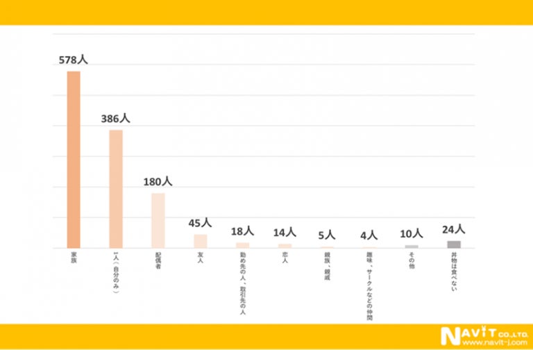丼物は誰と食べることが多いですか?というアンケートを複数回答でいただきました。「家族」と回答された人が578人と1番多い回答数となりました。次に多かったのが「1人(自分のみ)」で386人です。3番目が「配偶者」で180人という結果でした。