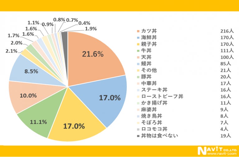 このアンケートは、回答が分散しています。その中で1番多かったのが「カツ丼」で21.6%です。次が「海鮮丼」と「親子丼」が17.0%と同数で続いています。