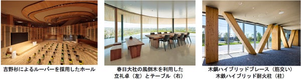 施設中央にあるホールでは、吉野杉などの奈良県産材をふんだんに採用しました。また、特別迎賓室「丹生庵」には春日大社境内の風倒木(杉)を利用した立礼卓(りゅうれいじょく)(※2)とテーブルを配置。さらに構造体には、奈良県産の集成材を座屈拘束材に用いた「木鋼ハイブリッドブレース」や同じく奈良県産の集成材を耐火被覆に用いた「木鉄ハイブリッド耐火柱」(※3)を採用しました。