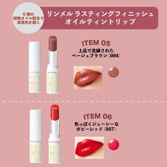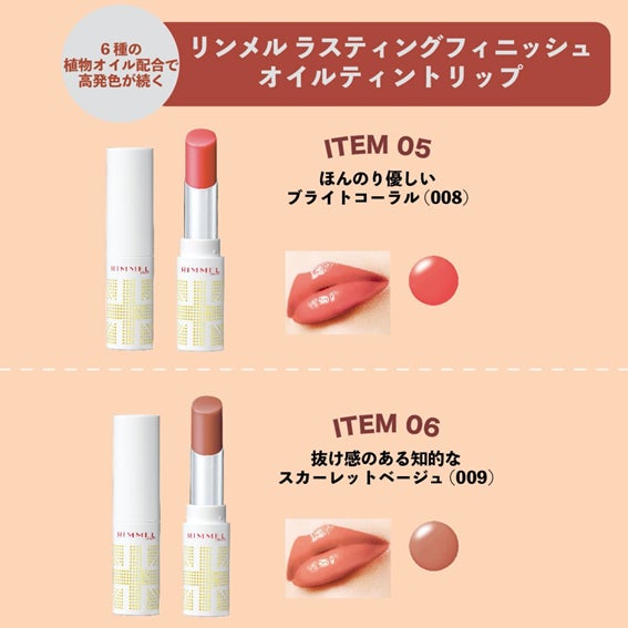 ほんのり優しいブライトコーラル、抜け感のある知的なスカーレットベージュ、ともに6種の植物オイル配合で高発色が続きます。