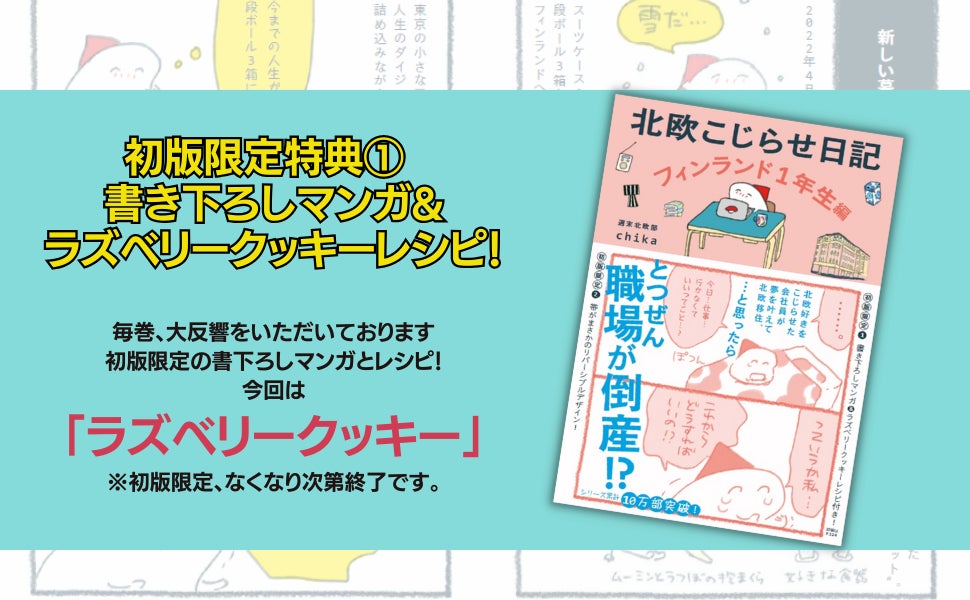 書籍『北欧こじらせ日記 フィンランド1年生編』の発売(11月8日)を記念して、書店限定 来店特典として先着2,000名様に『北欧こじらせ日記』未公開マンガ&レシピをプレゼントいたします。