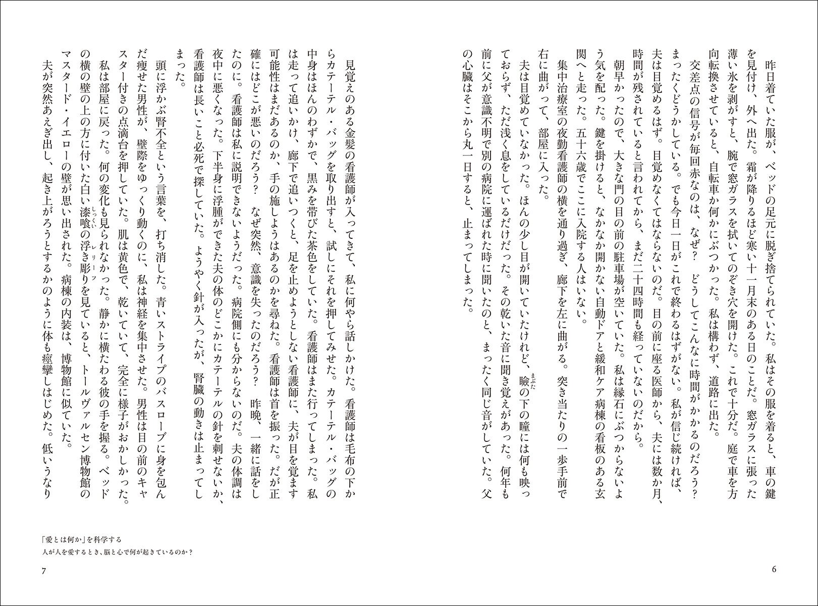 過去の記憶と、心理士のアスガー・ノイマンなどの研究者たちと対話を交わす中で、ネットの登場によるコミュニケーションの変容、心理学における愛着研究の変遷、恋愛による脳の活動や分泌される化学物質など、愛にまつわる様々なテーマについて、哲学、心理学、神経科学、進化生物学など複数の学問を横断しながらめぐる壮大な精神的旅路。