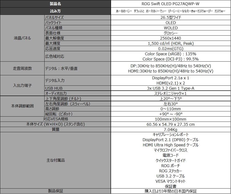 製品詳細:https://rog.asus.com/jp/monitors/27-to-31-5-inches/rog-swift-oled-pg27aqwp-w/