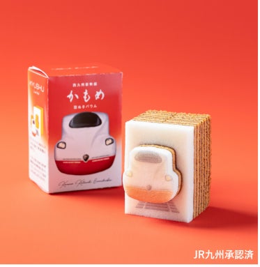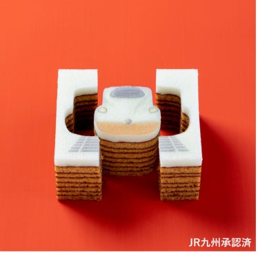芳ばしいキャラメルに海塩をほんのりきかせた生地を、丁寧に焼き重ねた平焼きバウム。いちばん上の真っ白い生地には西九州新幹線かもめの車両を描き、形にそってほどこしたカットラインで、型ぬきしながらお召し上がりいただけます。