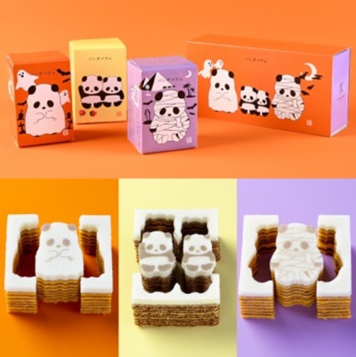 ハロウィンのおたのしみにぴったりのパンダバウム。真っ白シーツをかぶった「おばけパンダ」と、ぐるぐる巻きのモンスターに扮した新しい仲間「ミイラパンダ」の2つの限定バウムがパンプキン味で登場です。トリックとトリートがいっぱい詰まった贈りもの。型ぬきしながら、めしあがれ!