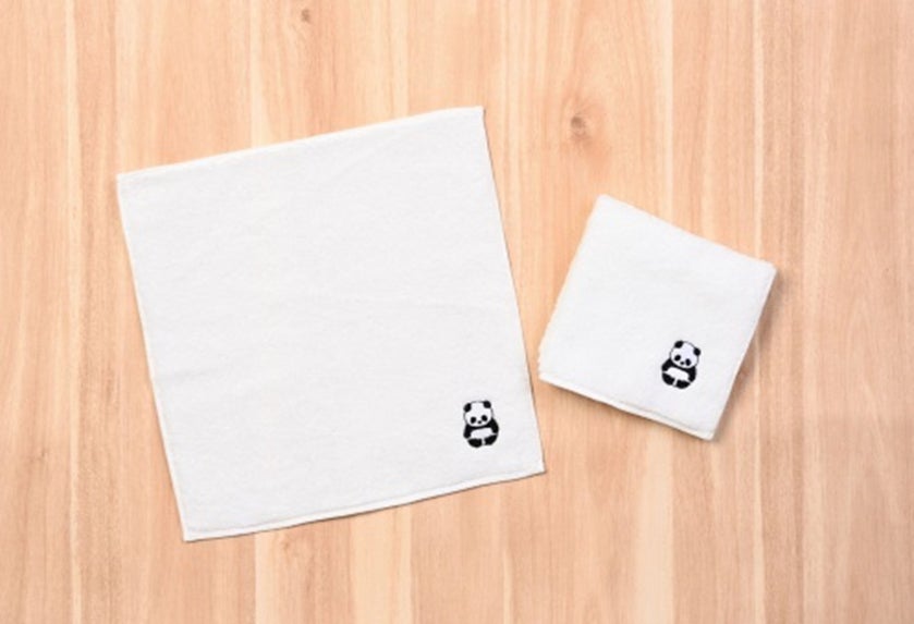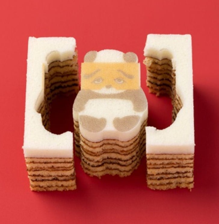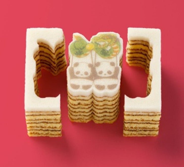 卵とアーモンドがふんわりと香るプレーン生地を、丁寧に焼き重ねた平焼きバウム。いちばん上の真っ白生地をキャンバスにして、二○加のお面をつけたパンダのプリントとカットをほどこしました。