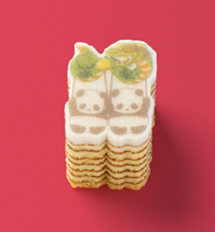 卵とアーモンドがふんわりと香るプレーン生地を、丁寧に焼き重ねた平焼きバウム。いちばん上の真っ白生地をキャンバスにして、長崎くんちの龍踊(じゃおどり)を舞うパンダのプリントとカットをほどこしました。そっと型ぬきしながらお召し上がりください。