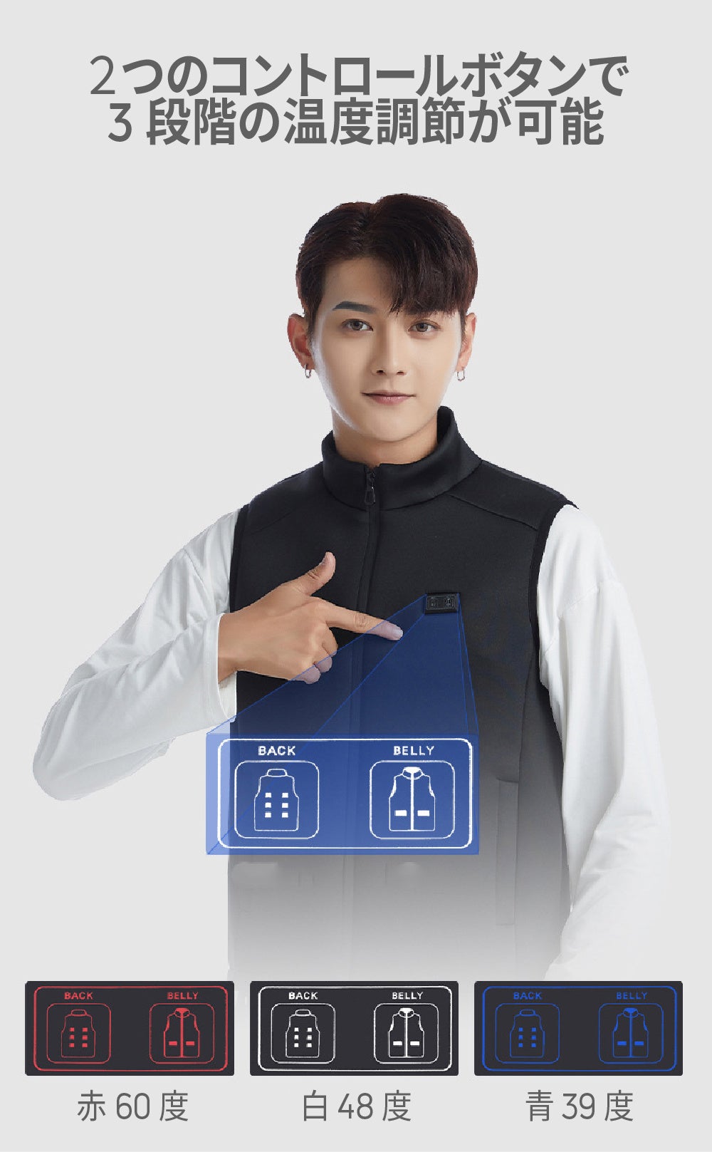 左側のボタンがベストの前面、右側のボタンがベストの背面につながっており、お好みに合わせて温度の調節が可能。