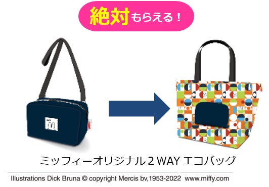 ① 対象商品に貼付されている応募マーク(㉒Chマーク)25枚を集めて送ると、ミッフィーがデザインされた、2WAYエコバッグが絶対に貰える。