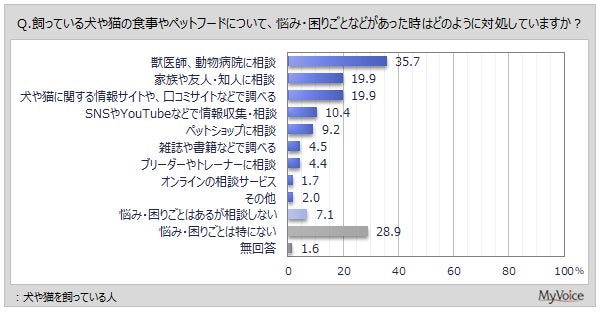 犬や猫を飼っている人に、食事やフードに関して悩みがあった時の対処法を聞きました(複数回答)。「獣医師、動物病院に相談」が35.7%、「家族や友人・知人に相談」「犬や猫に関する情報サイトや、口コミサイトなどで調べる」が2割です。