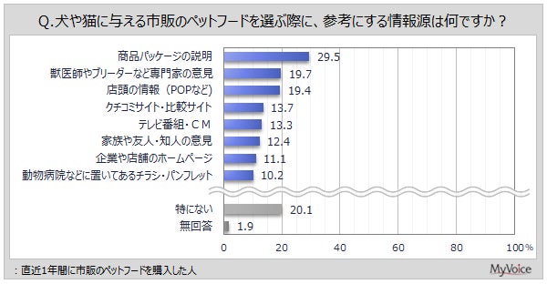 【ドッグフード・キャットフードに関する調査】直近1年間にペットフードを購入した人の情報源は「商品パッケージの説明」が3割弱、「獣医師やブリーダーなど専門家の意見」「店頭の情報」が各2割弱