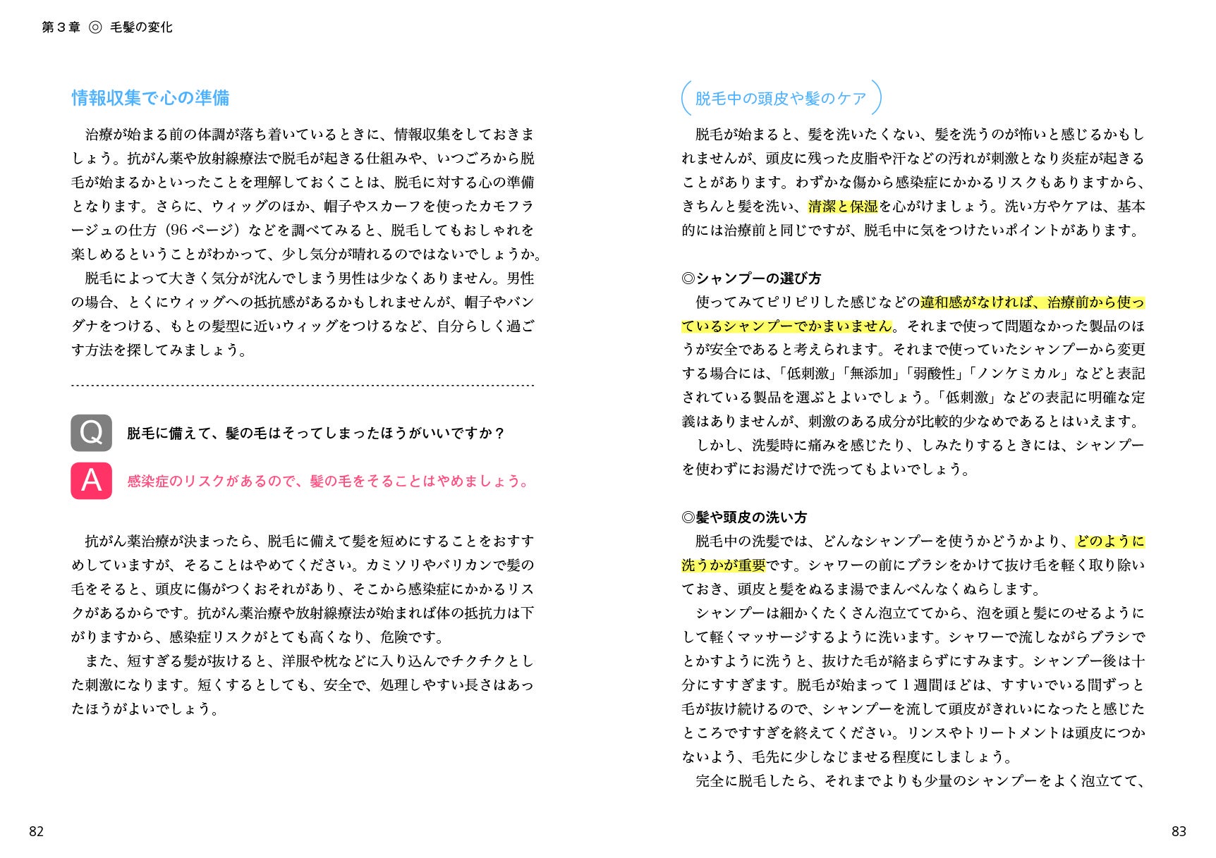 このほか「育毛剤や美白化粧品を使っても大丈夫?」「ウィッグをつけた自分にどうしてもなじめない」「近所や職場の人に、皮膚障害のことをどのように伝えればよい?」など、患者さんの疑問や悩みに答えるQ&Aのコーナーもあります。