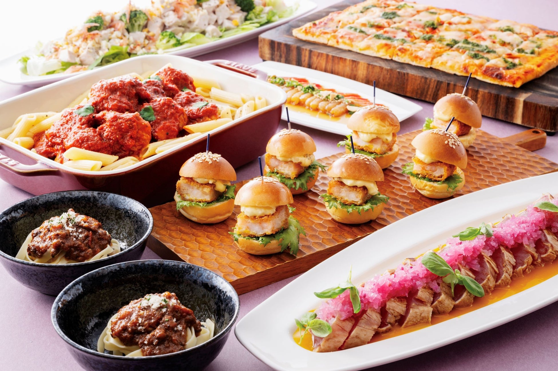 牛肉と新玉葱のマリネ レンズ豆のサラダ / 甘海老のカンジャンセウ / いちごの冷製スープとアールグレイのジュレ / チキンと桜海老 ブロッコリーのミモザサラダ / マグロのグリル パッションフルーツ&バジル / カプレーゼサンド / 北海道産アイナメと貝類のマリニエール風 / 奥丹波どりの赤ワインビネガー煮 / ゴロゴロえびカツバーガー / ベイクド・ホット・スモークサーモン / 桜海老と春キャベツのペペロンチーノ / カットステーキ&ガーリックピラフ / フライドポテト&オニオンリング / ピッツァロマーナ / ボタニカルカレー など
