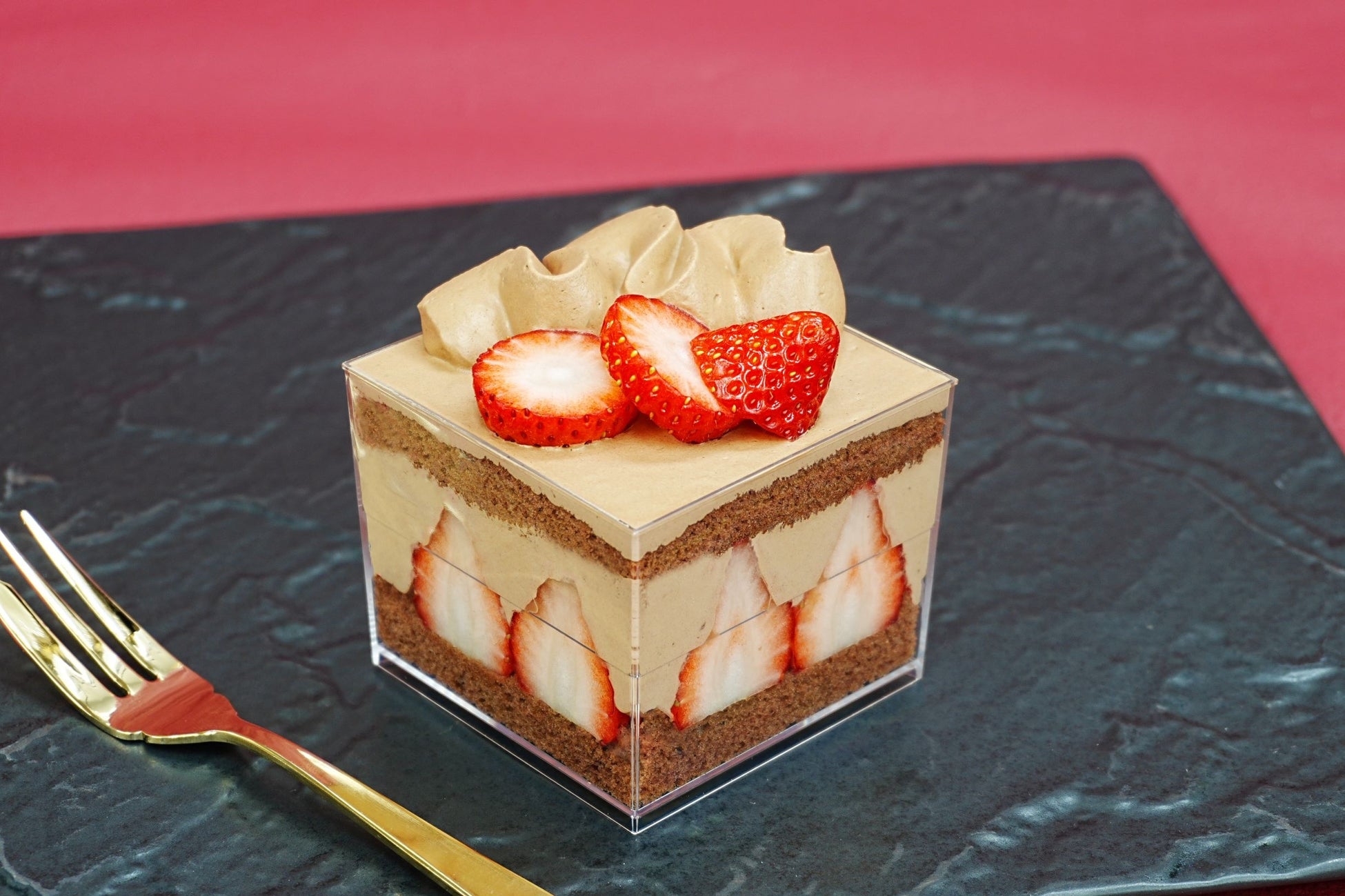 たっぷり入った苺の爽やかな酸味とカカオ56%のチョコレートを使ったクリームの甘さ、ふわふわのスポンジ生地が相性抜群の一品。