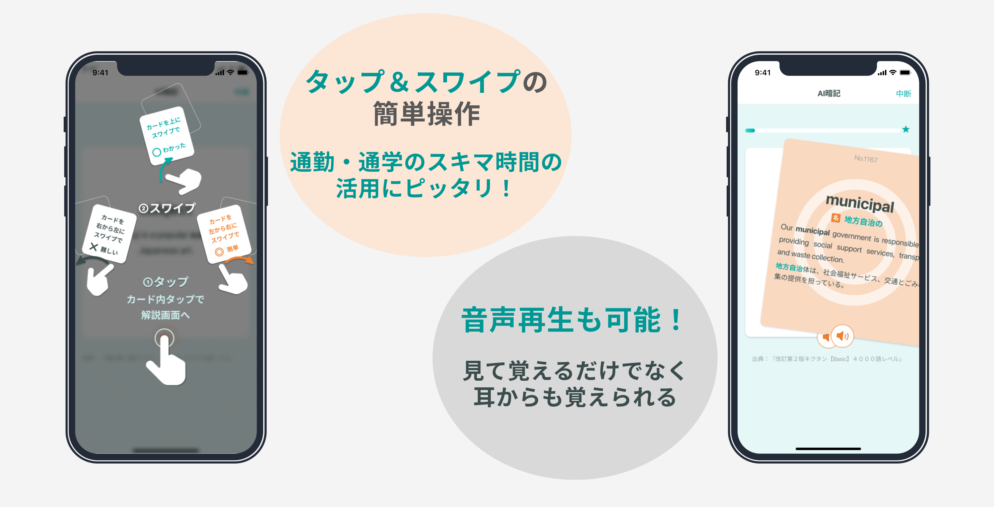 「AI暗記」は、自分で単語帳を作る必要がなく、記憶する仕組みに沿った、最適なタイミングでの復習をご提案します。さらに、タップとスワイプのみの操作で、いつでもどこでも学習しやすいため、スキマ時間で効率的に単語力を上げることが可能になります。