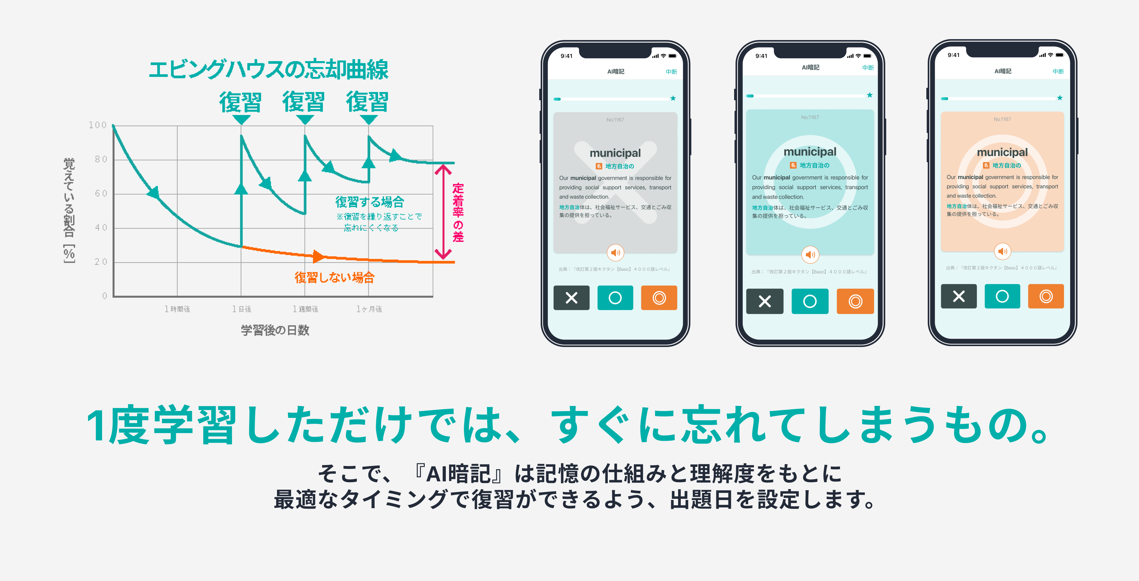 ■単語ごとに理解度を選択。忘却曲線に基づいた適切な復習タイミングで再出題。