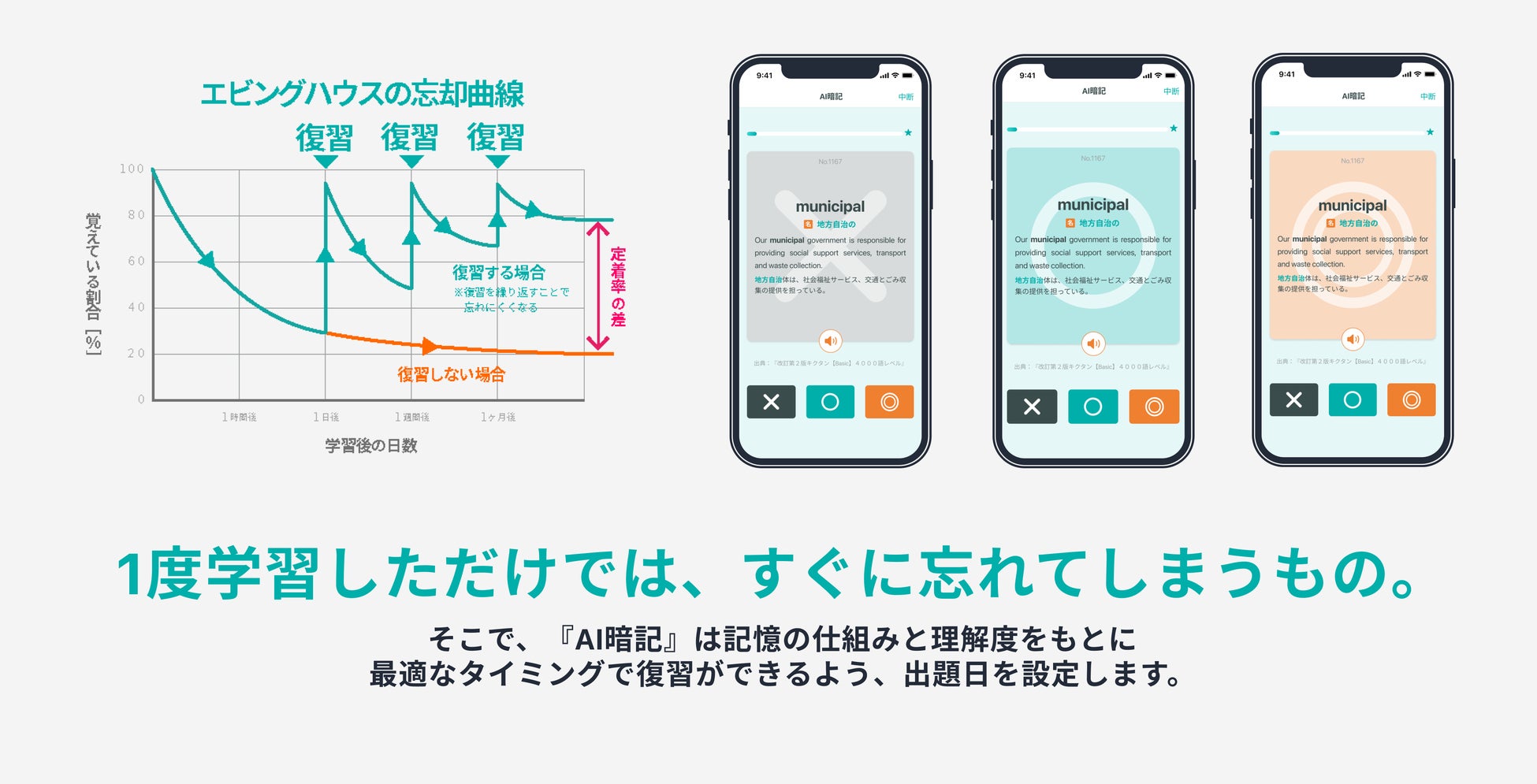 「AI暗記」は、単語のインプットはもちろん、記憶の仕組みと、理解度に基づいたロジックで、復習から定着までをサポートする機能です。ユーザー独自の復習サイクルを提供し、過去に学習した単語を、復習が必要となる最適なタイミングで再出題します。そのため、量を求めて学習しがちな単語学習においても、最短距離で効率良く記憶の定着を図ることができるのです。