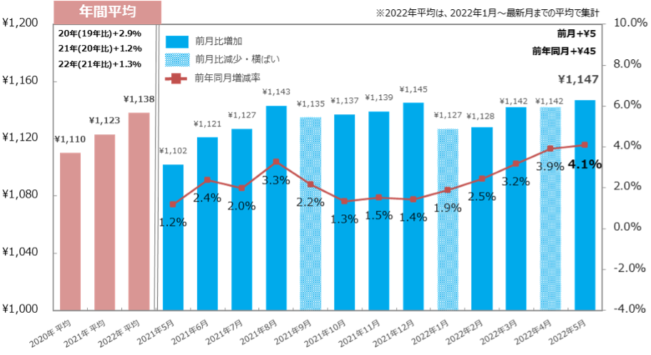 22年5月の全国平均時給は1,147円で、前月比・前年同月比ともに増加。21年5月以降、平均1,100円以上で推移しており、調査を開始した20年1月以降、過去最高額を更新した。【図1】