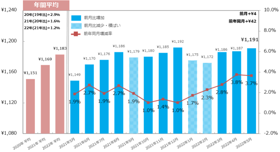 22年5月の全国平均時給は1,147円(前月1,142円、前年同月1,102円)。前年5月以降1,100円以上で推移し、過去最高額を更新。