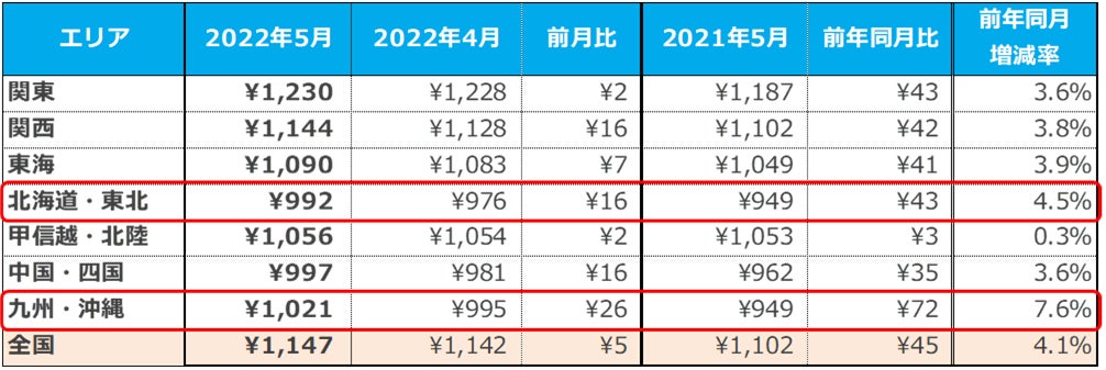 また、「北海道・東北」は992円で、前月比16円の増加、前年同月比43円の増加(増減率:+4.5%)。全7エリアすべてで前月比・前年同月比ともに増加した。【図4】