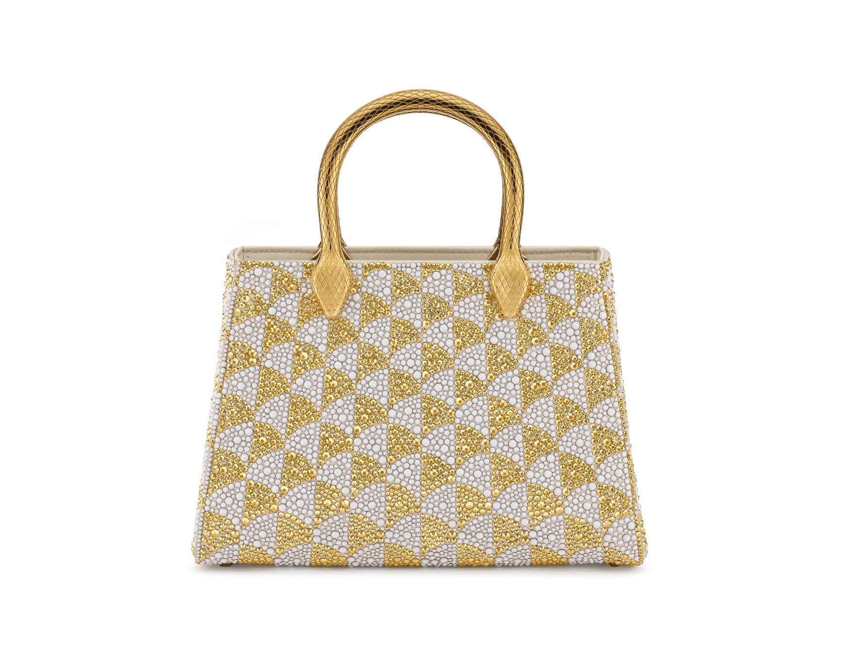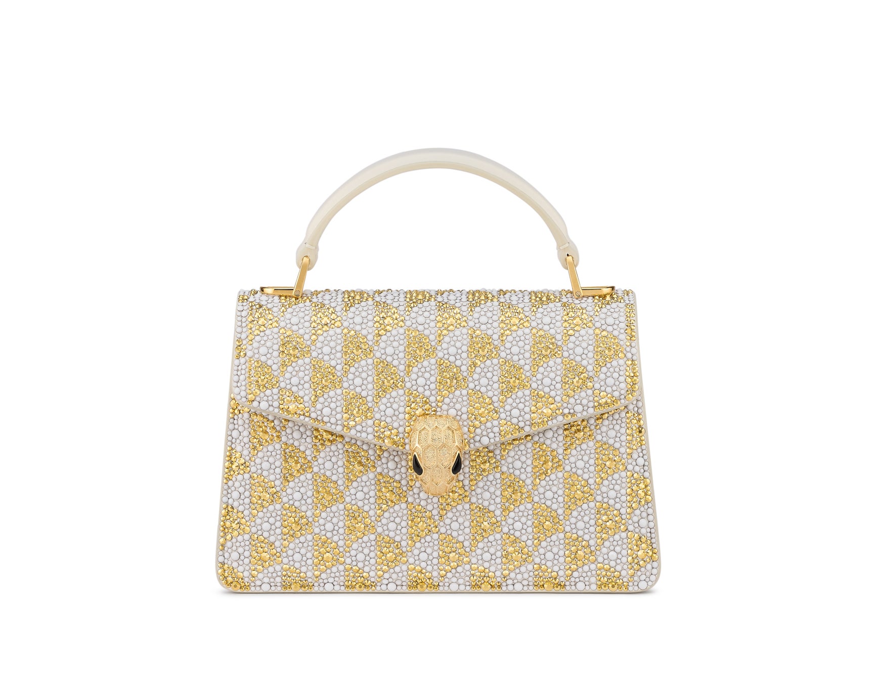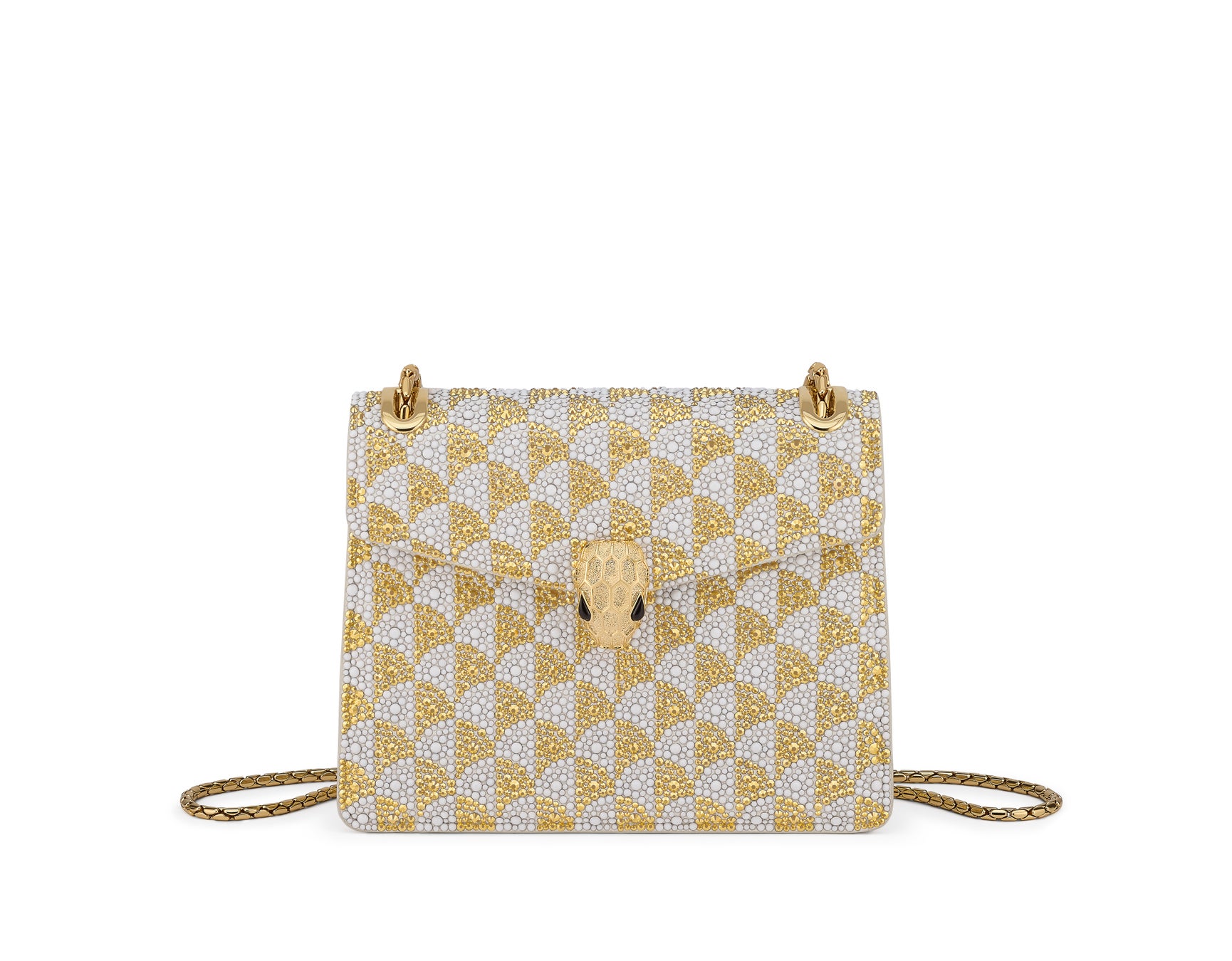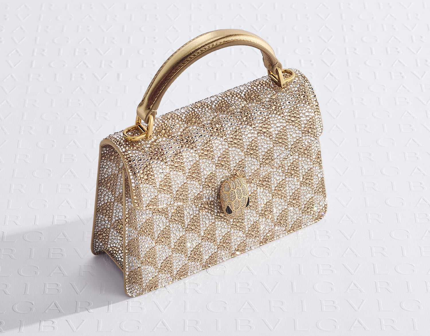 2025 年秋冬レザーグッズ&アクセサリー コレクションでは、このモチーフがアイコニックなセルペンティ デュオ、セルペンティ フォーエバー トップハンドル、セルペンティ フォーエバー デイ トゥ ナイト バッグに魅力を添える、きらめく“カラ” クリスタル パターンとして復活しました。何百個ものトパーズカラーとプラチナカラーのクリスタルが、ひとつひとつ手作業で巧みに施され、ローマのカラカラ浴場の扇形の多色モザイクを彷彿とさせる、ブルガリの完璧なクラフツマンシップを輝かせます。
