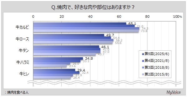焼肉を食べる人に、好きな肉や部位を聞いたところ(複数回答)、「牛カルビ」「牛ロース」「牛タン」が上位3位となっています。