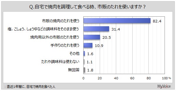 「市販の焼肉のたれを使う」が82.4%、「塩、こしょう、しょうゆなどの調味料をそのまま使う」が31.4%、「焼肉用以外の市販のたれを使う」が20.5%です。