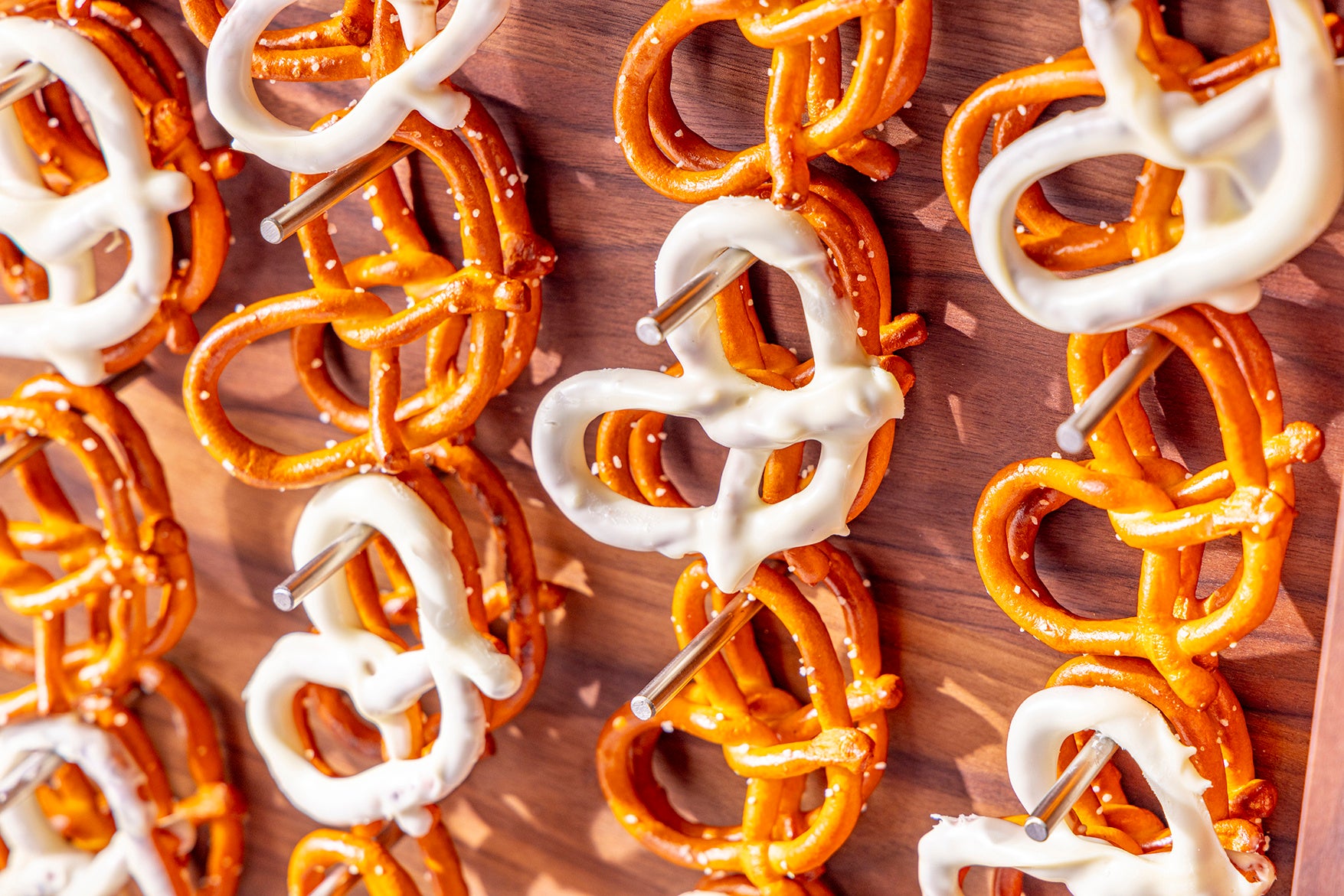 今回のビュッフェでは、純白の雪景色に映える真紅の苺をイメージし、白と赤のコントラストが華やかなデザートを多数ご用意しました。白いドームの中にたっぷりの苺が隠された「苺のショートケーキ」、シチリアの郷土菓子「苺のカッサータ」はリコッタチーズの爽やかな酸味とレアチーズのような食感が特徴です。「白胡麻のブランマンジェ」や「ミルクプリン」は、濃厚なミルクと生クリームの風味を活かした滑らかな舌触りです。また、ホワイトチョコレートをディップしていただくプレッツェルは、ほんのり効いた塩気と甘味が絶妙なバランスでお子さまから大人までご満足いただける一品です。