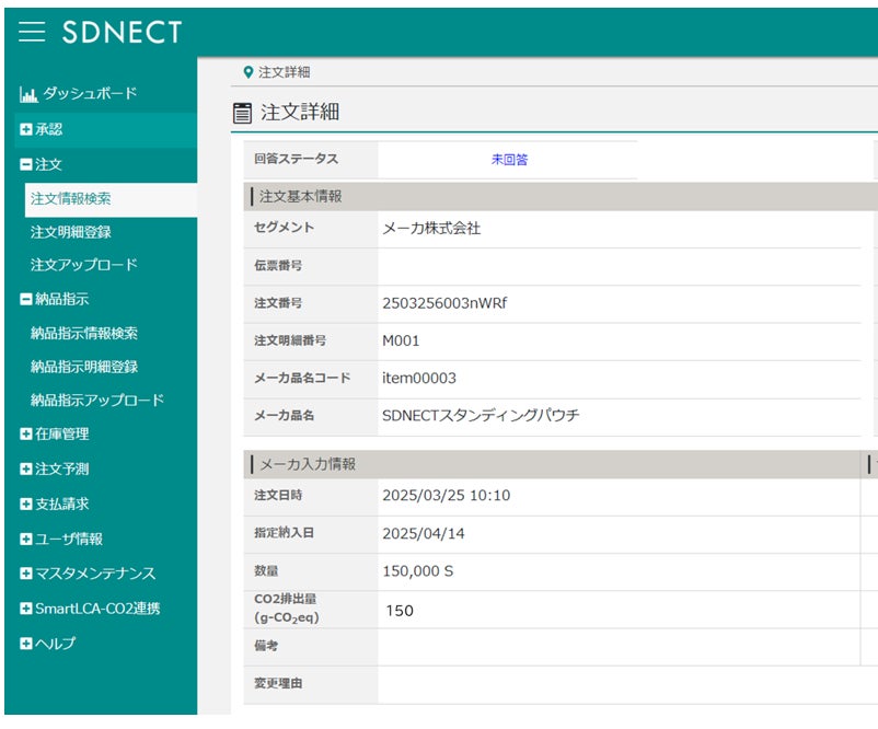 本機能追加により、「SDNECT®」上で取引される発注資材について、納期、数量、単価(金額)などと併せてCO₂排出量について管理が可能になります。