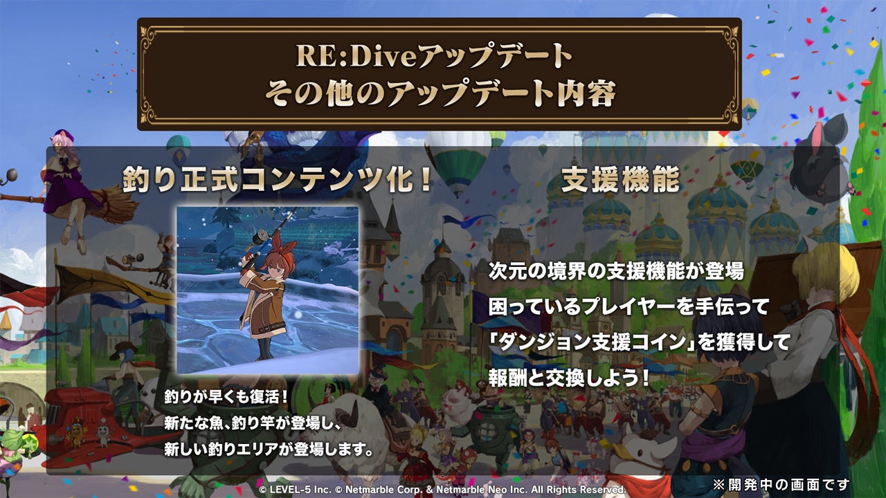 この他にも、釣りシステムの正式コンテンツ化に加え、初心者プレイヤーを高レベルのベテランプレイヤーがサポートしてくれるダンジョン支援システムなども追加しております。