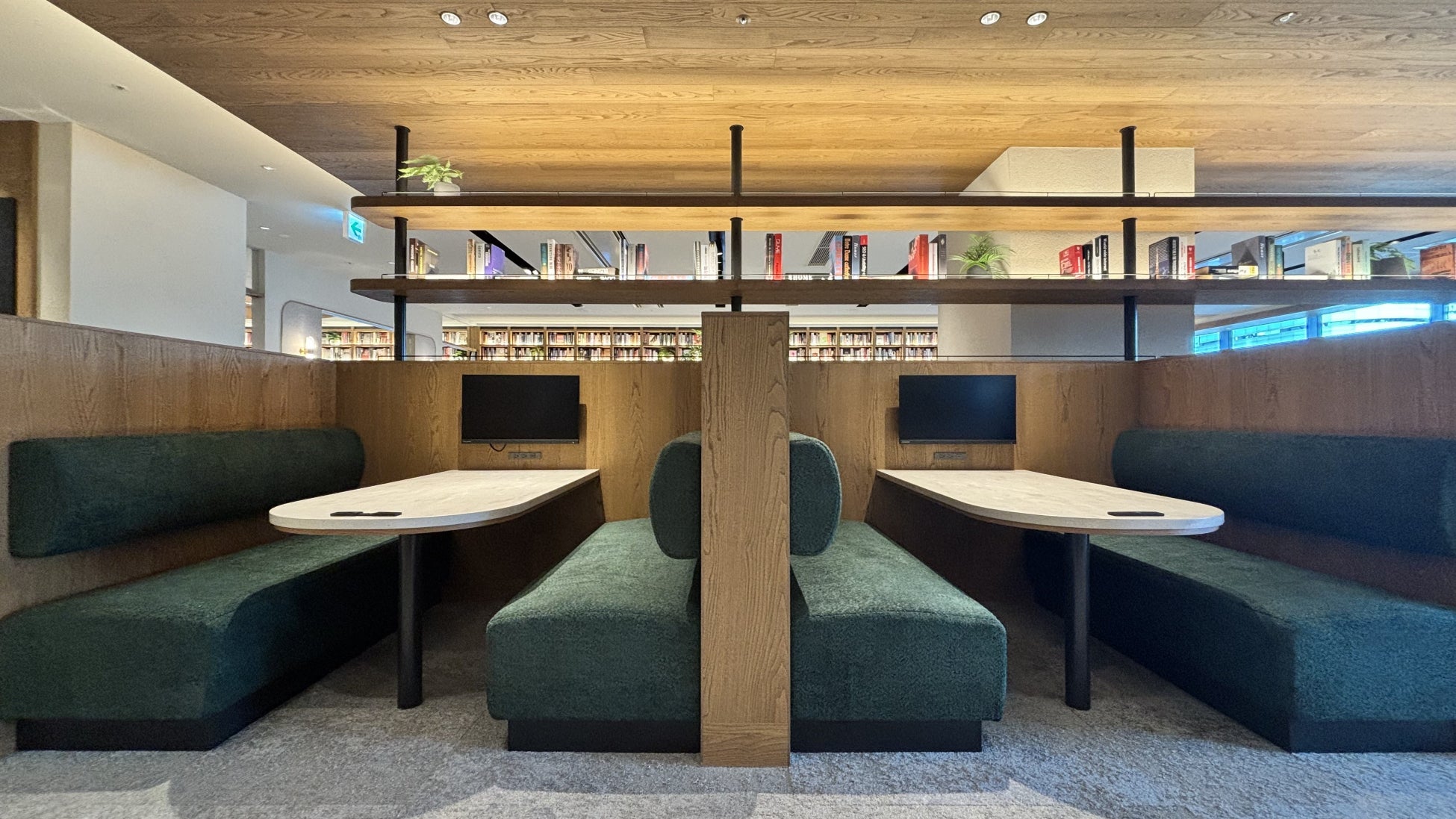 SHARE LOUNGEでも特に人気の高い半個室席を10席設置しモニターを完備し、視線を程よく遮る設計で、オンライン会議や資料作成など、高い集中力を要する作業に最適な環境を整えました。