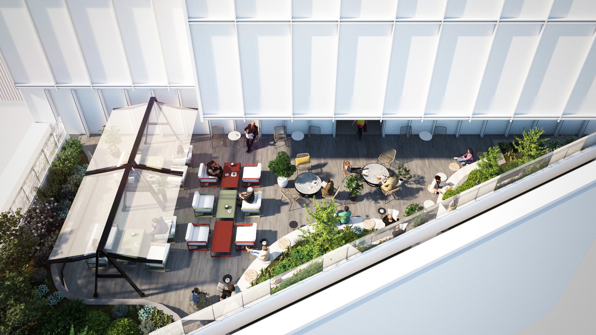 屋外テラスは、オフィス就業者とSHARE LOUNGE利用者の双方に開放し、緑を感じながらリラックスできる空間は、思考を整え、新しいアイデアのきっかけを生む場にもなります。再開発が進む池袋西口エリアの景色とともに、都市の中にひと呼吸置ける余白を設けました。