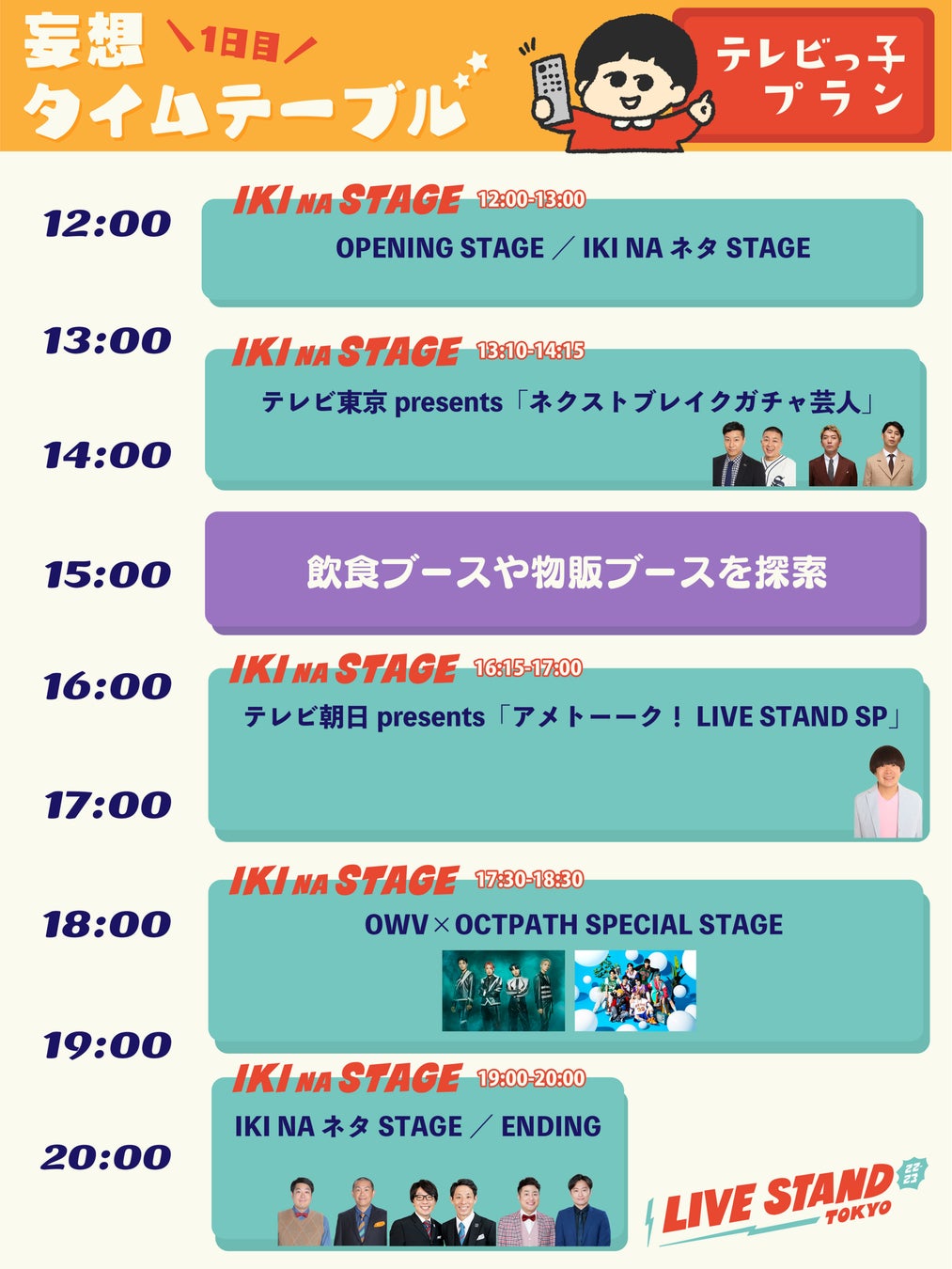 “ライブスタンジャー”だけでなく、実力派芸人から今大注目の若手芸人まで、さらに人気ボーイズグループOWV、OCTPATHの出演決定により、大人から子どもまで、会場のどこにいても楽しめるイベントとなっております。タイムテーブルの組み合わせは自分次第!大中小のステージのみならず、体験コーナーやバラエティに富んだ飲食ブース、グッズコーナーなどを組み合わせて、『LIVE STAND 22-23 TOKYO』と一緒に夏の思い出作りをしてみてはいかがでしょうか。本リリースでは、パターン別のタイムテーブルもご提案しておりますので、ぜひチェックしてみてください。