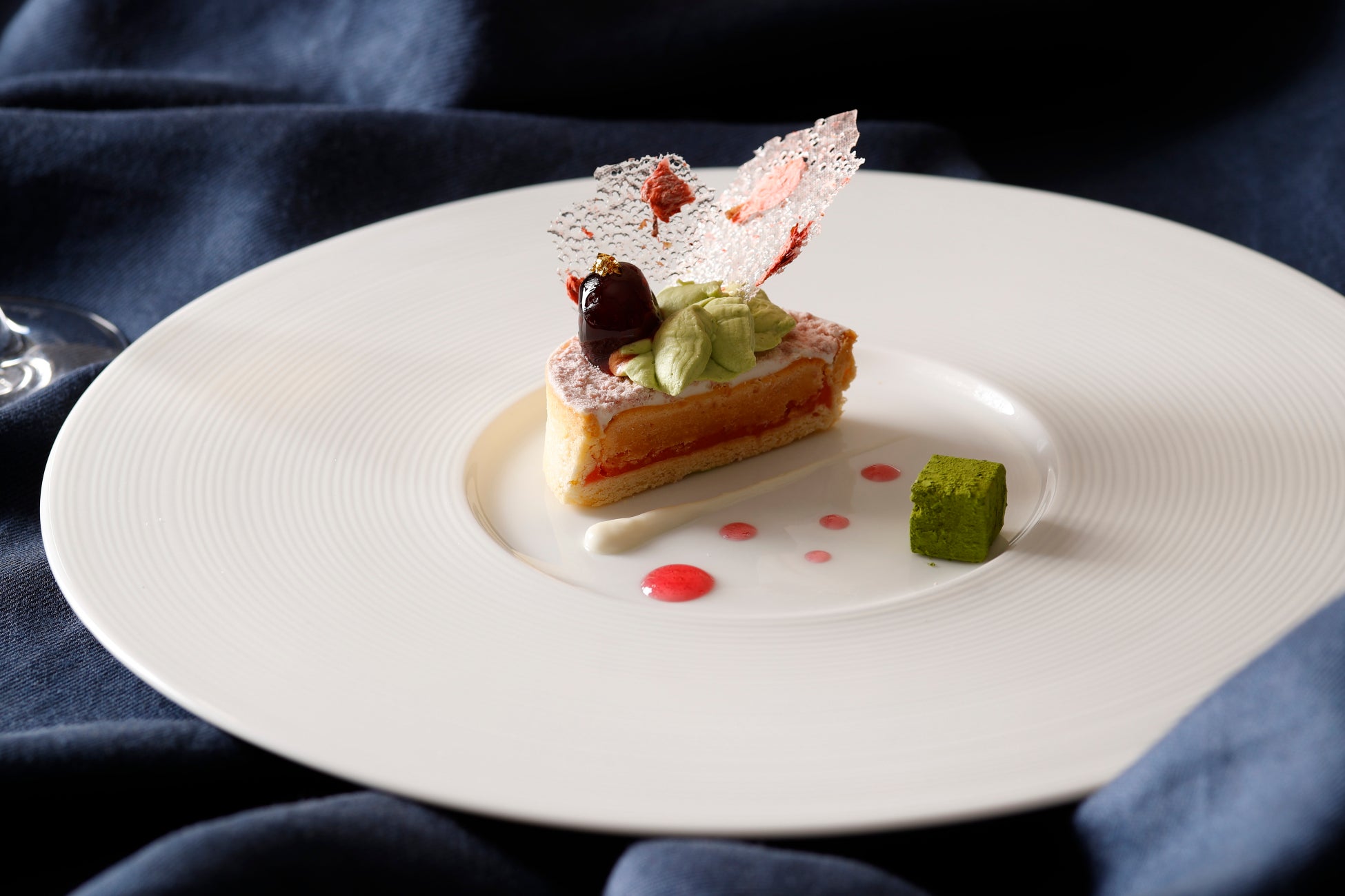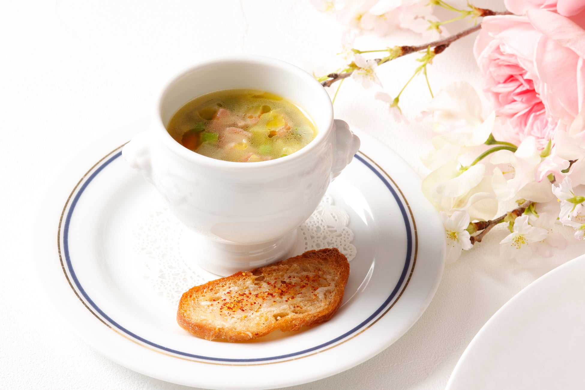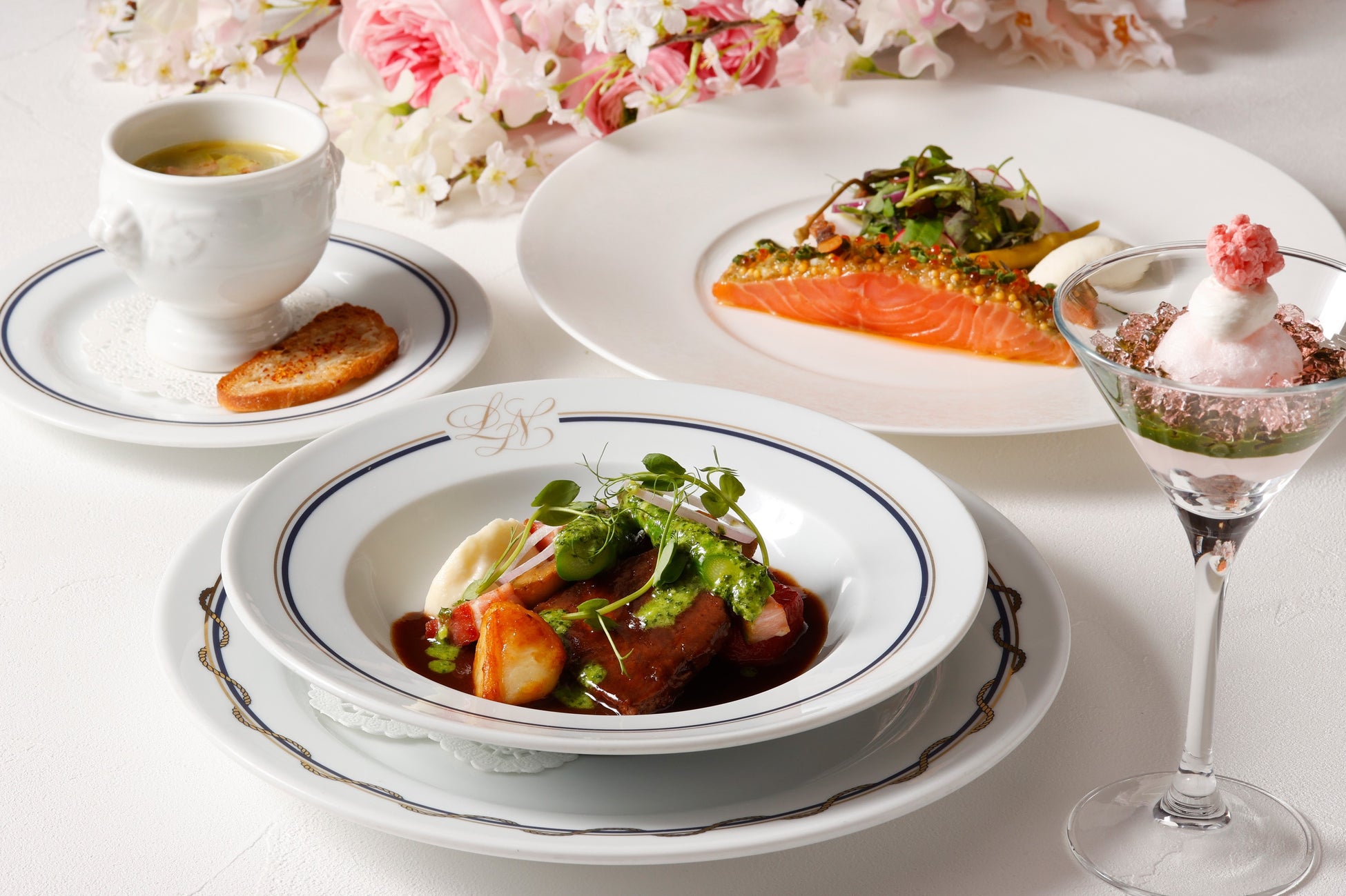 ランチでは、柔らかくしっとりとした食感に仕上げた色鮮やかなサーモンや、旬のホワイトアスパラガスをレモンバターソースで仕上げた前菜のほか、なめらかな口どけの桜香るブランマンジェにほろ苦い抹茶ソースを合わせたデザートなど、前菜3種、メインディッシュ4種からお選びいただくプリフィックススタイルにてお楽しみいただけます。ディナーでは、綺麗なグリーンが映えるグリーンピースのスープに始まり、春に美味しい食材をふんだんに使用したメニュー、桜風味の濃厚なベイクドチーズケーキを和テイストに仕上げたデザートなど、華やかな春ならではの味覚をご堪能いただけます。春爛漫を華やかに表現した、門出のお祝いにふさわしい美食メニューの数々です。豪華客船をイメージした優雅な雰囲気の店内で、新たな旅立ちを祝うお食事のひとときをいかがでしょうか。