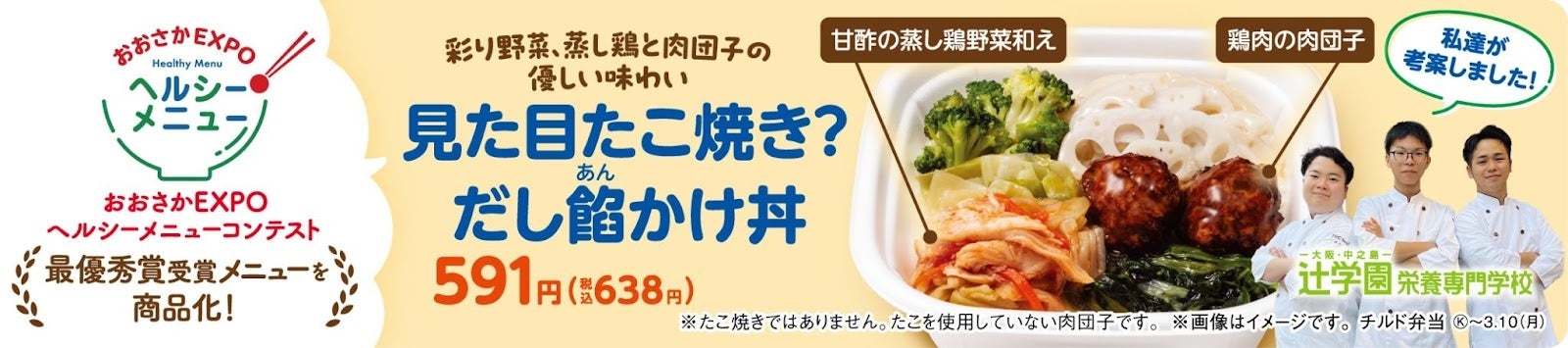 このたび、2025年4月開幕の大阪・関西万博にむけた大阪府の取組み「おおさかEXPOヘルシーメニュー」コンテストにて最優秀賞を受賞した辻学園栄養専門学校の学生が考案したメニューのアイデアをもとに開発した弁当を発売いたします。具材には大阪産「キャベツ」の使用し、V.O.S.(※)の基準にそった、健康に配慮した商品となっております。また、商品名についても「おおさかEXPOヘルシーメニュー」コンテスト最優秀賞受賞メニュー名を踏襲した「見た目たこ焼き?」とし、たこ焼きをイメージした柔らかい食感の肉団子をトッピングしております。今後も地域との連携を強化し、地域活性化に協力してまいります。