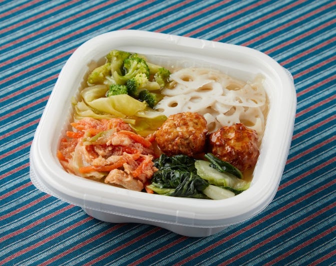 【内容】だし・しょうゆ・みりんベースの優しい味わいの餡に、鶏肉の肉団子は、魚介の旨味を加え、蒸し鶏と人参和えは付け合わせとして少し甘辛い味わいに仕上げました。大阪府産の「キャベツ」を使用し、食感のアクセントにレンコンをプラス、彩りにもこだわりました。