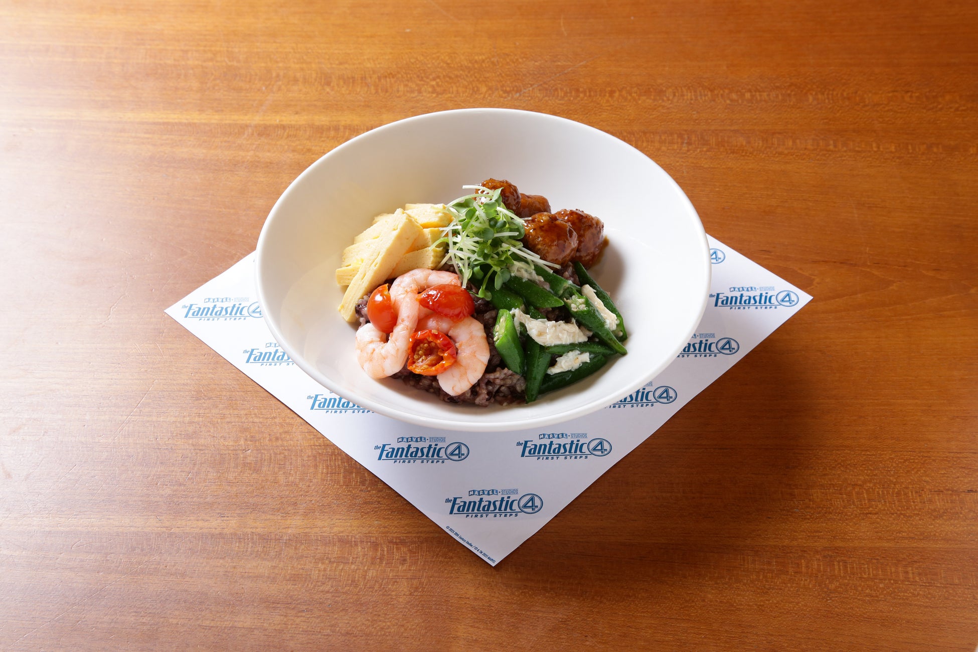 4人をイメージした4色丼。ミスター・ファンタスティックは伸びるオクラ、インビジブル・ウーマンはふんわり卵焼き、シングはゴツゴツした肉団子、ヒューマン・トーチは海老とトマトで表現した特製丼。