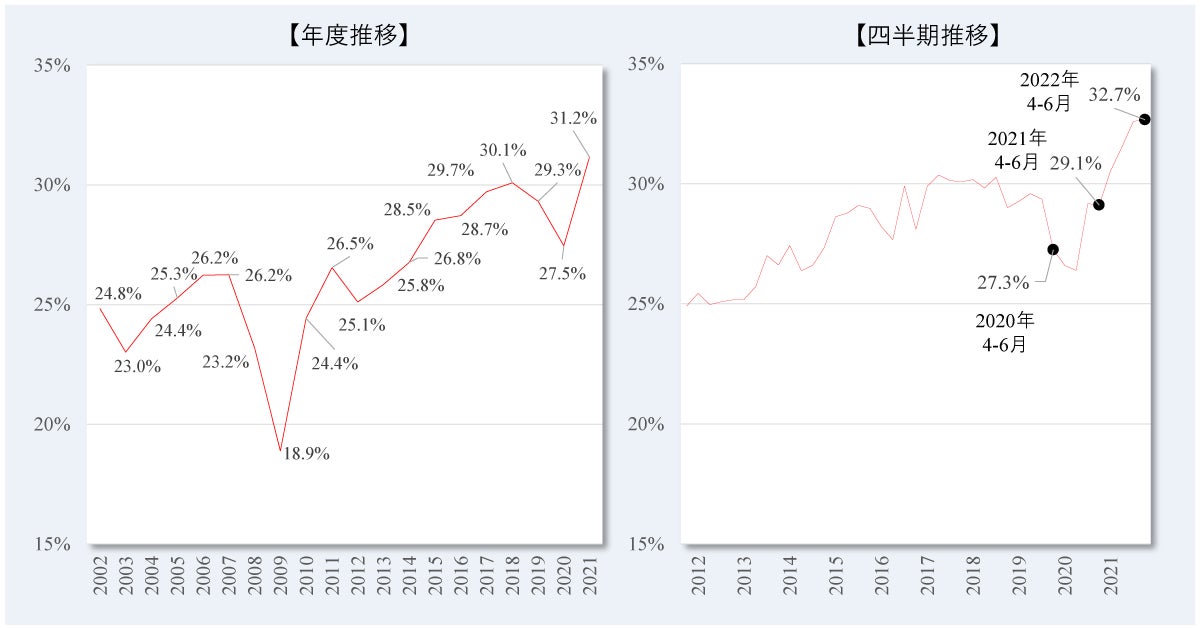 新型コロナウイルスの感染が拡大を始めた2020年1-3月期を起点に大きく水準を切り下げたが、翌年2021年1-3月期には概ね感染拡大前の水準近くに復した。足元2022年4-6月期は、そこから更に伸長を続けており、最高値を更新している(当統計の始点である2002年4-6月期以降の最高値)。