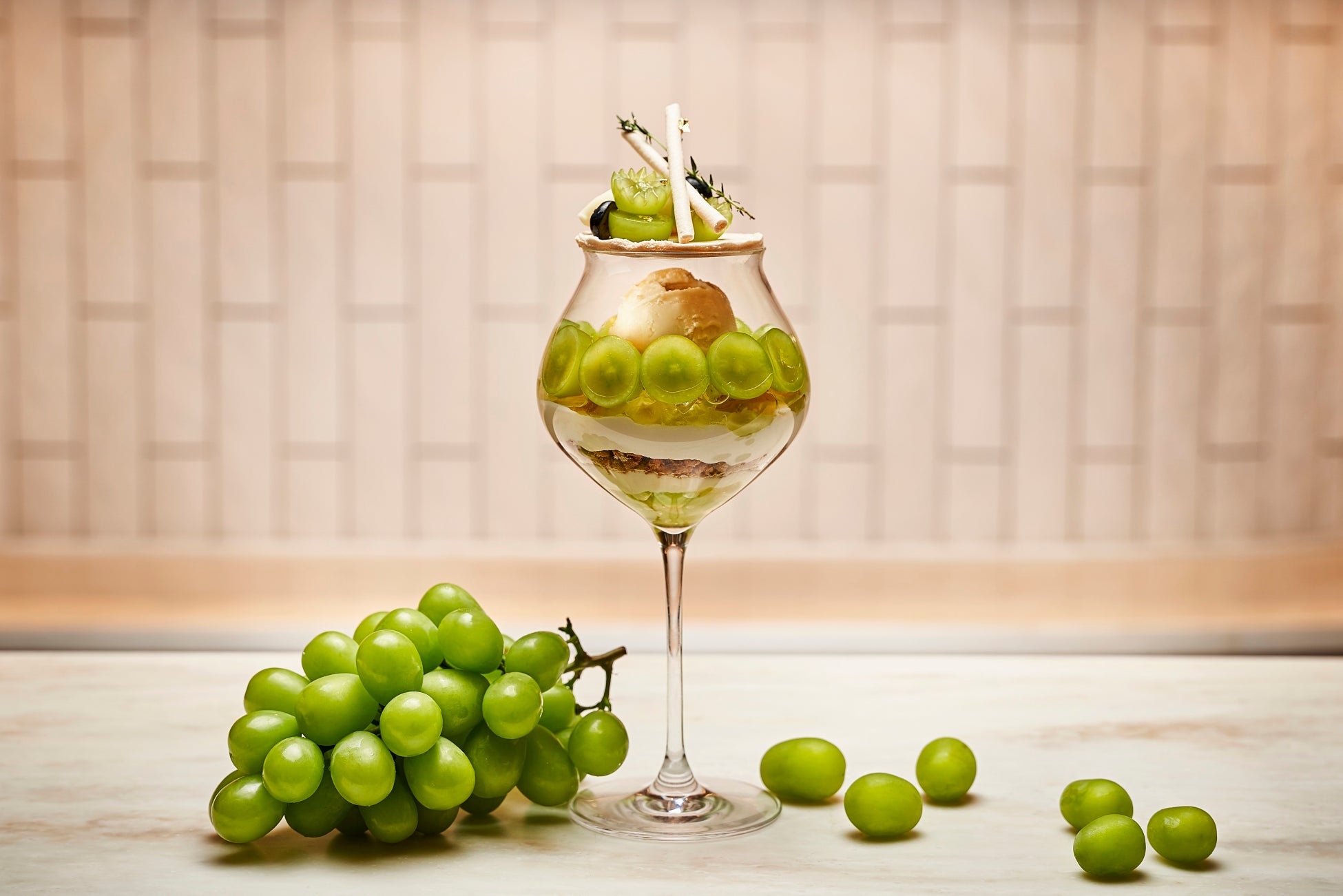 トップには、さっぱりとした洋梨のソルベとともに⽪ごと楽しめるシャインマスカットを添えていま