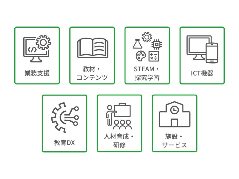 学校・教育機関、企業の人事・研修部門などの方に向けた日本最大級の教育分野の展示会です。年に2回、東京ビッグサイト、インテックス大阪で開催。教育現場の課題に合わせ、業務支援、教材・コンテンツ、探究学習・STEAM教育、ICT機器、教育DX、人材育成・研修、施設・サービスの7つのエリアで構成しています。