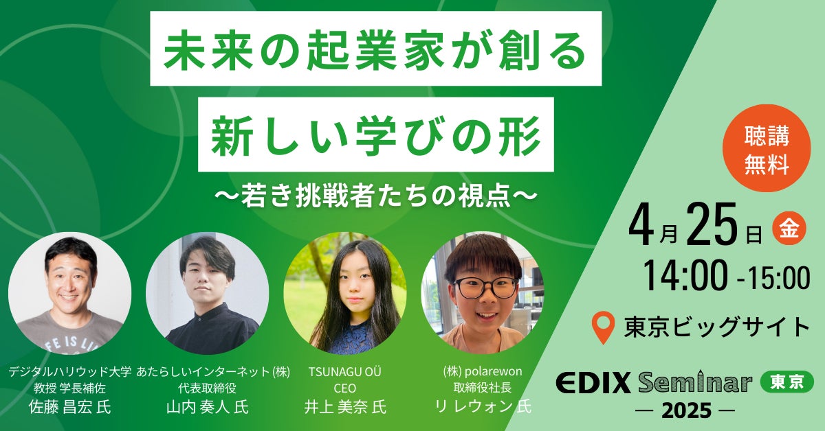 小学生から高校生で起業した若き挑戦者たちが登壇。既存の教育に縛られず、学びを創造する姿から未来の教育の可能性を探る。