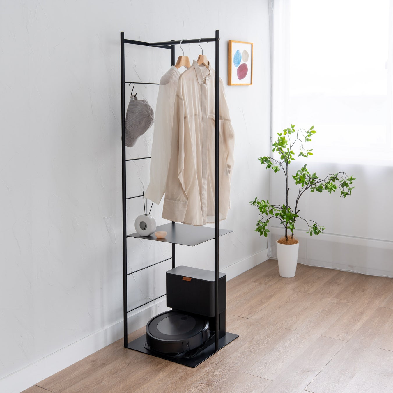 脚を三脚にしているため、ロボット掃除機のごみ回収や水補充が楽にできます。また、ハンガーバーやサイドバー付きで、洋服や帽子、バッグなどをたっぷりかけることも可能です。いずれも圧迫感のないデザインで、お部屋をすっきりと見せることができます。
