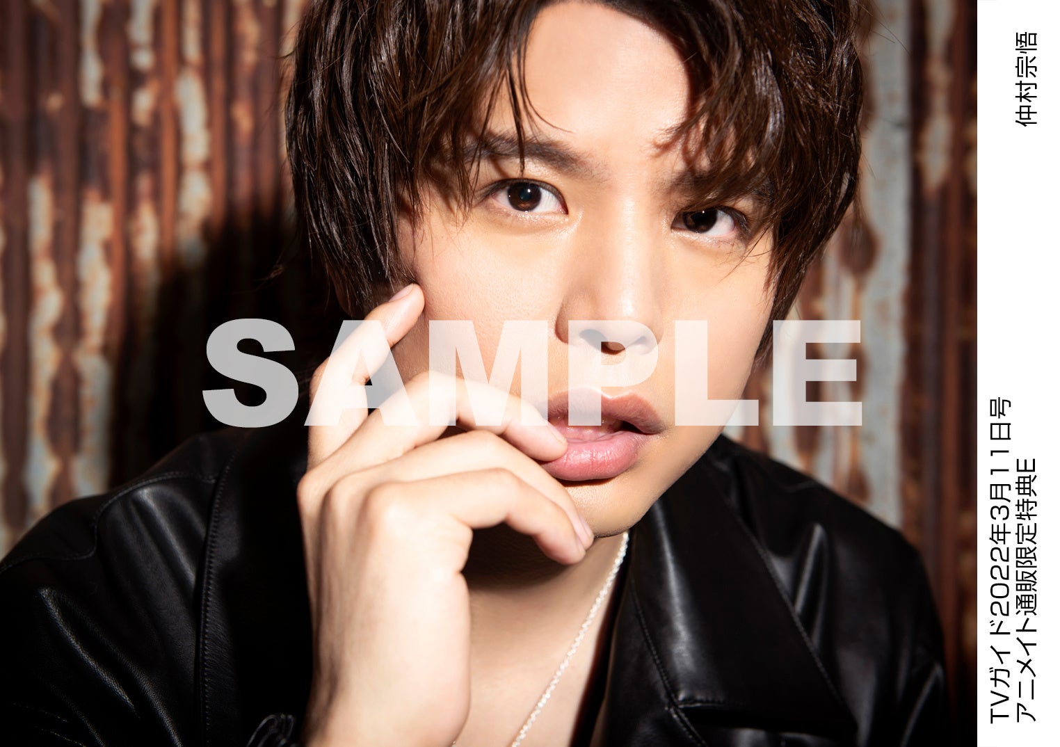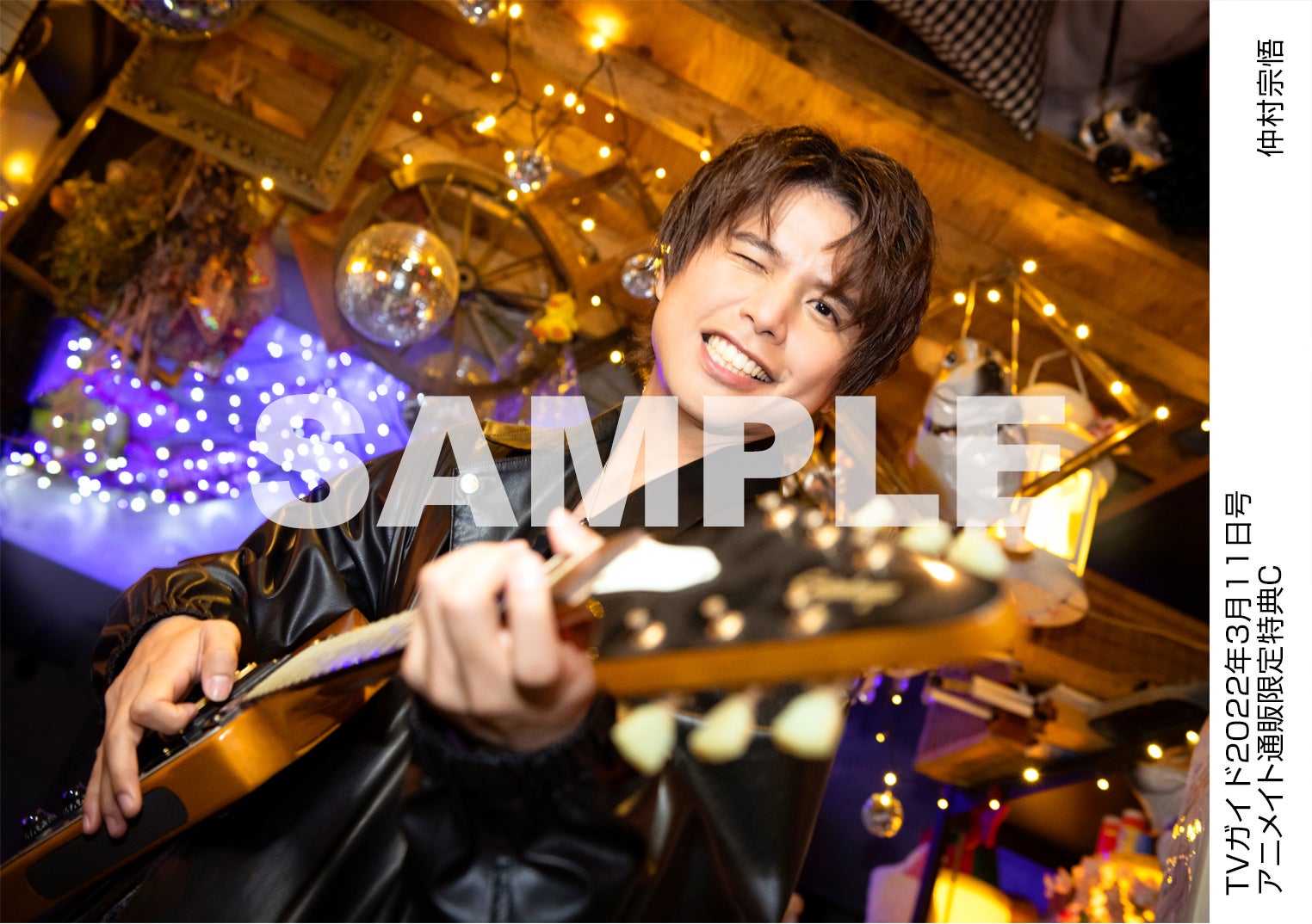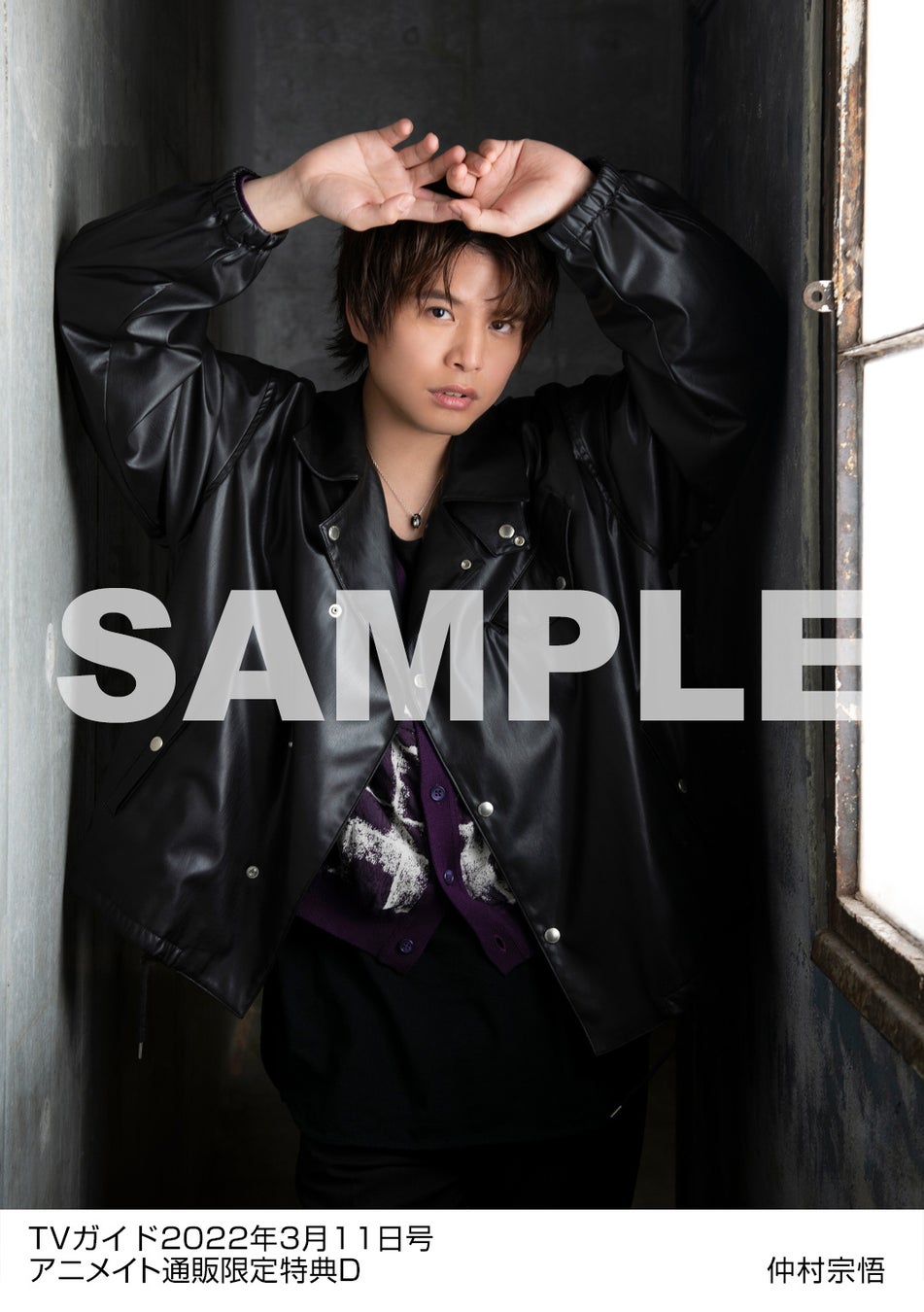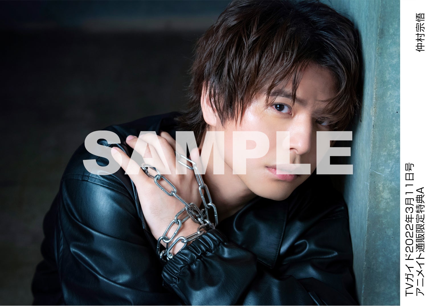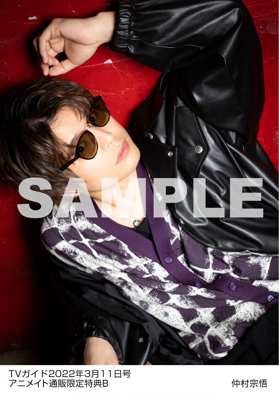 また、アニメイト通販にて「TVガイド関東版2022年3/11号」を購入すると、特典として仲村宗悟生写真がプレゼントされる限定企画も。鎖を手に巻き付けていたり、サングラスを掛けたショット、ギターを持ったカット、さらには、こちらを見つめているショットなど、全6種類の絵柄のなかから1枚を選ぶことができる。