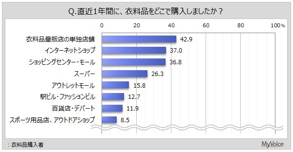 衣料品購入者が直近1年間に購入した場所は(複数回答)、「衣料品量販店の単独店舗」が42.9%、「インターネットショップ」「ショッピングセンター・モール」が各4割弱です。