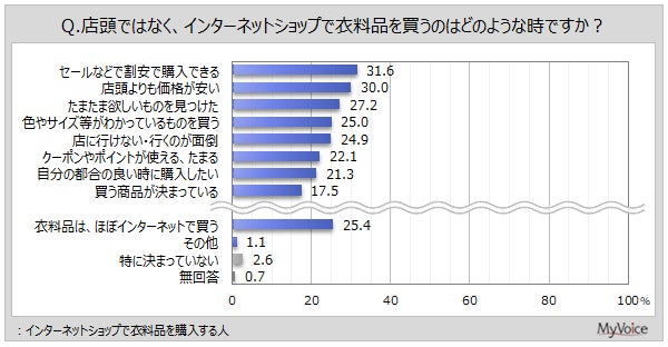 「セールなどで割安で購入できる」「店頭よりも価格が安い」「たまたま欲しいものを見つけた」が3割前後です。「衣料品は、ほぼインターネットで買う」が25.4%となっています。